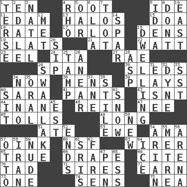 ACROSS 1. Nine, plus one 4. Carrot, for example 8. Binary compound 11. Dutch treat 13. Rings 15. ___ good deed 16. Assign a rank or rating to 17. Fourth or lowest deck 18. Hiding places for outlaws 19. Narrow boards 21. "One Day ___ Time" 22. Electrical Unit 23. Snakelike fish 24. Call ___ day 27. Actress Charlotte 29. Connect, as a bridge 30. Bobsleighs 34. At this time 36. Not women's 39. Frolics 40. "Two Mules for Sister ____" 41. Leg coverings 43. Is not 44. Empty; void 46. It's straight from the horse's mouth 47. Born 48. For Whom the Bell _____ 49. Having great length 51. Had dinner 53. She-sheep 54. Nanny (var.) 57. Pig sound 60. Science/research agcy. 63. One who wires 65. Loyal 66. Window treatment 69. Quote 70. Small amount or degree 71. Titles for men of rank and authority 72. Merit 73. Single 74. Elected reps. 75. Teachers' org. DOWN 1. Laconic 2. Peak District village in England 3. Brizilian seaport 4. 17th letter of the Greek alphabet 5. Boat paddle 6. Spanish pot 7. A blast of a horn 8. The content of cognition 9. Do not 10. 90 degrees 12. Was introduced to 14. Practice fight 18. Residence 20. Small drink 25. Pack (down) 26. Approach 28. Viper 29. Tchaikovsky ballet 31. Relaxation 32. Centimeter-gram-second unit of force 33. Fast jet (abbr.) 34. Billionth: prefix 35. Relating to the mouth 37. Compass dir. 38. Vertical member of a panel or frame 40. Be seated 42. Overwhelm 45. Eastern Standard Time (abbr.) 50. ___ Haven, CT 52. Conclusions 54. Believer in; advocate of (suffix) 55. Distance measurement (Brit.) 56. Sports stadium 57. Von Bismarck 58. SW Asia republic 59. Naked 61. Indian titles of respect 62. Conductor's collection 64. Frozen water 67. Animal enclosure 68. Double-curved letter