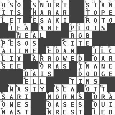 ACROSS 1. Bear (Spanish) 4. Derisive sound 9. Comedian Laurel of Laurel & Hardy 13. ___ a Wonderful Life 14. Ethiopian city, capital of Harari 15. Drink excessively 16. Allow 17. 1973 Nobel Price Winner (Physics) Leo 18. Printing process, for short 19. Beverage made from leaves 21. One (Scot) 22. Small pieces of grounds 24. Anneal 26. Director Reiner 27. Mexican monetary units 29. Quote 30. Place in a line 31. Dutch treat 33. Affectionate concern, for short 36. 54 in ancient Rome 37. Moved like an arrow 40. Boat paddle 41. Observe 42. Mouths or openings 43. Empty; void 45. Raised platform 47. Evade 48. Pipe bend 49. Canisters 50. Offensive 52. Ocean 54. Baseball player Mel 56. Indian skirt 57. Typical standards 59. Mouth or opening 61. Singles 62. Fertile tracts in a desert 63. Fr. "Yes" 64. Political cartoonist Thomas 65. Obtain by seizing forcibly or violently 66. Directed DOWN 1. Lubricate 2. Proofreading order 3. Clearly or manifestly demonstrative 4. A female animal or person 5. Rhinal 6. NW Algerian seaport 7. Immoral or dissolute person 8. Three (prefix) 9. Disco prop 10. A blast of a horn 11. Flats, for short 12. Modern: prefix 20. Period of immesurable duration 22. A-one 23. Car dealer's back yard 25. Toward the sea 27. Friends 28. Writer Wiesel 29. Crow sounds 31. Blunders 32. ___ good deed 33. Inedible or poisonous agaric 34. Austrian-born American filmmaker Fritz 35. Algonquian 38. Agitated, as a liquid 39. "You Light Up My Life" star Conn 44. Words to Nanette 45. Cease 46. Keyboard modifier key 49. Corrects by punishment or discipline 50. Grandmother 51. Ancient Greek god of war 52. Fly high 53. Celtic language 55. Loyal 56. Manchild 57. At this time 58. Fast jet (abbr.) 60. Assist