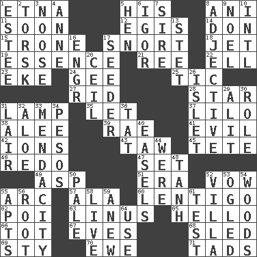 ACROSS 1. Inactive volcano in Sicily 5. Part of HMS, perhaps 8. Black tropical American cuckoo 11. Within a short period 12. The front part of a cuirass 14. Spanish title 15. Heavy duty weighing machine 17. Derisive sound 18. Type of plane 19. Center 21. To riddle 22. Pipe bend 23. Make supply last 24. Unit of force equal to gravity 25. Nervous spasm 27. To free from 28. Play the lead 31. Desk light 35. Allow 37. _ and Stitch 38. Toward shelter 39. Actress Charlotte 41. Tending to cause great harm 42. Charged particles 43. The 23rd letter of the Hebrew alphabet 45. Wig 46. Make new 47. Arrange properly for use 49. Viper 51. Period 52. Promise 55. Curve 57. Chicken ___ king 60. Small, flat, pigmented spot on the skin 62. Luau course 63. "_ and Lucy" (Charlie Brown theme song) 65. Phone greeting 66. Small child 67. Nights before holidays 68. Downhill vehicle 69. Filthy place 70. She-sheep 71. Small amounts or degrees DOWN 1. First name in cosmetics 2. Cod relative 3. Trap for birds or small mammals 4. Queen of England 1702-14 5. Layer 6. Russian composer Stravinsky 7. Male parent of an animal 8. Descriptive word 9. Christmas carol 10. International (abbr.) 13. Proofreading order 16. Engineer (abbr.) 17. Sowing specialist 20. To provide with a ceiling 26. Small island 29. Set down 30. Hero or heavy, e.g. 31. Den 32. Medicinal plant 33. Ananias' fault 34. Mexican monetary units 36. Make lace 40. Artist's stands 44. We are 48. Hyperbolic tangent 50. Light colored 52. Country residence 53. Stared at amorously 54. Forest 55. Tenement units (abbr.) 56. Carrot, for example 58. Not recorded 59. Afresh 61. Trial 64. Purpose