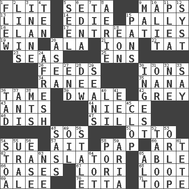 ACROSS 1. Sudden quick movement 5. Bristle 9. Atlas contents 13. Actor's bit 14. Singer Brickell 15. Friendly 16. Enthusiasm 17. Pleas 19. Acquire through effort 20. Insect wing 21. Electrically charged atom 22. Make lace 23. Oceans 25. Followers of ems 26. Gives food to 30. Charged atoms 34. The wife of a rajah (variant) 35. Nanny 36. Not wild 39. A sleeping potion; an opiate (poet.) 42. Jennifer or Joel 43. Pismires 44. Sibling's daughter 46. Food container 47. Beverly of Met fame 48. Distress signal 51. "Beetle Bailey" pooch 54. Take to court 57. Small island 58. Infant food 60. Tate display 62. Interpreter 65. Competent 66. Fertile tracts in a desert 67. Australian parrot (variant) 68. Spoils 69. Toward shelter 70. Singer James 71. Drink excessively DOWN 1. Soared 2. Ms. Damita and namesakes 3. Empty; void 4. Nine, plus one 5. Stitch closed the eyes of (a falcon) 6. Pulitzer Prize-winning author Ferber 7. Teat (slang) 8. Nest on high 9. Floor covering 10. Set down 11. Entreaty 12. System (abbr.) 15. Zero-star reviews 18. A really long time 20. Toward the sea 24. Anew 27. Conclude 28. Morning condensation 29. Actors Connery and Penn 30. Swallow 31. Boat paddle 32. Compass dir. 33. Declare 36. Bit 37. Black tropical American cuckoo 38. Mountains (abbr.) 40. Cards in a Roman deck? 41. Snakelike fish 45. Hoof sound 48. Backtalk 49. Lubricate 50. Lacking originality or spontaneity 52. Off limits 53. Lowest deck of a ship 54. Portico 55. Mountain range 56. Comfort 58. Sweet dark-red dessert wine 59. Roberta Peters solo 61. Wig 63. Born 64. Small child 65. Keyboard modifier key