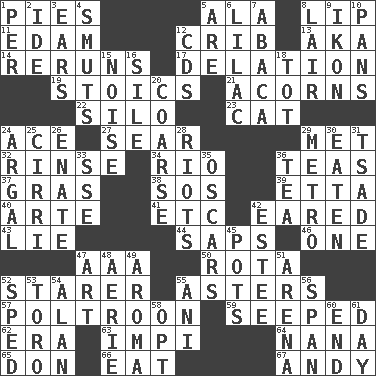 ACROSS 1. Sliced desserts 5. Wing 8. Mouth edge 11. Dutch treat 12. Baby bed with high sides 13. Alias (abbr.) 14. Summer TV shows 17. Accusation by an informer 19. Unemotional ones 21. Oak nuts 22. Grain storage tower 23. Feline 24. Adept person 27. Scorch 29. Was introduced to 32. Remove soap 34. River (Sp.) 36. Afternoon social gatherings 37. Pate de foie ____ 38. Mayday 39. Singer James 40. Johnson of "Laugh-In" 41. And so on (abbr.) 42. Having ears or earlike features 43. Untruth 44. Plant excrements 46. Single 47. Auto club (abbr.) 50. Roll call or roster of names 52. A viewer who gazes fixedly 55. Michaelmas daisies 57. Coward 59. Oozed 62. Epoch 63. Body of Kaffir warriors 64. Nanny 65. Spanish title 66. Ingest 67. "60 Minutes" Commentator Rooney DOWN 1. For each 2. Binary compound 3. Hearing organs 4. Particles of soot 5. "We ___ not amused" (Victoria) 6. Pale purple color 7. Phillipine bananalike plant 8. Den 9. Visual representation of an object 10. Zero-star reviews 12. Music discs 15. Annoying sound 16. Filth; sediment 18. Small child 20. Rough 24. Therefore, facetiously 25. High-altitude cloud 26. Related on the mother's side 28. Debaucheries 29. Paris' subway 30. Eroded 31. Sadhe (variant) 33. Compass dir. 35. Motion picture awards 36. Beverage made from leaves 42. First name in cosmetics 45. Plant holders 47. Nonscientific branch of learning 48. Nest on high 49. Odor 51. Sports stadium 52. Moved rapidly 53. "Corrida" creature 54. ____ Jay Lerner 55. Black tropical American cuckoo 56. Connect, as a bridge 58. Choose 60. Conclusion 61. 24 hours
