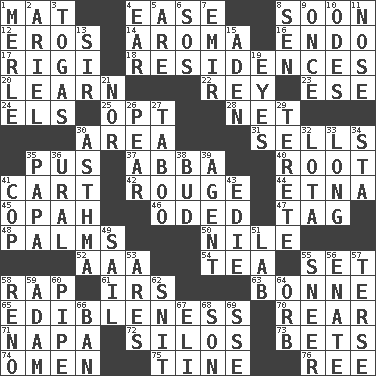 ACROSS 1. Floor covering 4. Relaxation 8. Within a short period 12. Greek god of love 14. Scent 16. Inside; within (prefix) 17. Swiss mountan, "Queen of the Mountains" 18. Dwellings 20. Acquire or gain knowledge or skills 22. Marina Del _, California 23. Compass dir. 24. Raised railways 25. Choose 28. Remaining after all deductions 30. Type of rug 31. Exchanges for money 35. Fluid product of inflammation 37. Swedish rock group 40. Carrot, for example 41. Heavy open wagon 42. Makeup applied to the cheeks 44. Inactive volcano in Sicily 45. Brightly colored fish 46. Wrote a lyric poem 47. Label 48. Insides of hands 50. Mediterranean tributary 52. American Automobile Association (abbr.) 54. Beverage made from leaves 55. Arrange properly for use 58. Hit sharply and swiftly 61. Big collection agency 63. Child's nurse 65. The property of being fit to eat 70. Posterior 71. California wine valley 72. Grain storage towers 73. Stakes 74. Sign of things to come 75. Prong on a fork 76. To separate or throw off DOWN 1. Haggard of country music 2. Satellite of Uranus 3. Ancient Roman robes 4. Hearing organ 5. "We ___ not amused" (Victoria) 6. Distress signal 7. Arab leader 8. Elected rep. 9. At one time in the past 10. Lyric poems 11. Olfactory organ 13. Title for a knight 15. An important port of Yemen 19. Snake ____ (dice throw) 21. Not either 26. Lightbulb-shaped fruit 27. Off limits 29. Cylindrical with tapered ends 30. Respiratory problem 32. Globular water bottle used in Asia 33. Having great length 34. R.R. building 35. Dad 36. Mountain range 38. Partially opened flower 39. Representative 41. Police officer (slang) 43. Singer Brickell 49. Move on water 51. Experiment locale 53. Ancient Greek god of war 55. Contemptuous expression 56. Maternal 57. Laconic 58. Western Nevada city 59. First man 60. Corncob 62. In a ____ (agitated or irritated) 64. Globe 66. Forbid 67. Connecticut Ivy Leaguer 68. Boy, to dad 69. Compass dir.