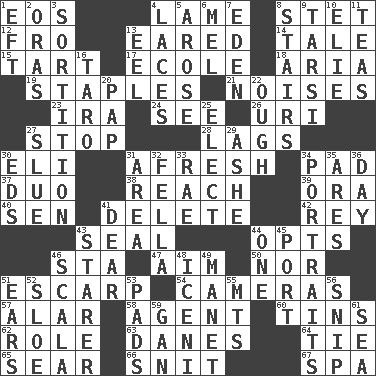 ACROSS 1. Greek goddess of the dawn 4. Unable to walk 8. Proofreading order 12. Back 13. Having ears or earlike features 14. Falsehood 15. Small pie 17. Learning spot: Fr. 18. Roberta Peters solo 19. Paper fasteners 21. Annoying sounds 23. Lyricist Gershwin 24. Perceive with the eye 26. RI univ. 27. Discontinue 28. Fails to keep up a pace 30. Connecticut Ivy Leaguer 31. Anew 34. Writing tablet 37. Superhero pair 38. Arrive at 39. Mouth or opening 40. Elected rep. 41. Keyboard key 42. Marina Del _, California 43. Lick closed 44. Elects 46. R.R. building 47. Direct toward a target or goal 50. Not either 51. Fortification 54. Devices for capturing images 57. Having or resembling wings 58. Rep 60. Metal containers 62. Hero or heavy, e.g. 63. Natives or inhabitants of Denmark 64. Standoff 65. Shrivel 66. In a ____ (agitated or irritated) 67. Health resort DOWN 1. Lizard (obsolete) 2. Mouths or openings 3. Casting lots 4. Shoestrings 5. Came up 6. Cartoonist voice _ Blanc 7. Paradise 8. Flight of steps 9. Tarsus (plural) 10. Writer Wiesel 11. Afternoon social gatherings 13. Snakelike fish 16. Pacific island yam 20. Infant food 22. Ending for "Through" and "Enough" 25. Choose 27. Change direction abruptly 29. American tennis player Robert 30. Begley and Asner 31. Type of rug 32. Man or boy (slang) 33. Actress Charlotte 34. Likenesses of persons 35. Ancient Greek god of war 36. 24 hours 41. Letter starter 43. A viewer who gazes fixedly 44. Single 45. Left side of a ship or aircraft 46. Any of the three canals of the cochlea 48. Ancient Celtic tribe of eastern Britain 49. French painter Edouard 51. Hearing organs 52. _ gin 53. Groovy apts. 55. Mountains (abbr.) 56. Sever or remove by pinching or nipping 59. Separate the seeds from cotton 61. Ocean