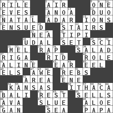 ACROSS 1. Cause heat under the collar 5. Wind 8. Single 11. Nights before holidays 12. Small Philippine buffalo 14. Superhero pair 15. Brizilian seaport 17. The sixth month of the Jewish calendar 18. Charged particles 19. Followed as a consequence or result 21. Flight of steps 23. Teachers' org. 25. Native american tent (variation) 26. Allodial 27. Put into a specified state 28. _-fi 31. Cartoonist voice _ Blanc 33. Reproach for some lapse or misdeed 35. Vegetable dish 37. Port city in Latvia 38. To free from 40. Hero or heavy, e.g. 41. Place in a line 43. Ewer handle 45. Snakelike fish 46. Raised railways 47. Deep reverence 50. Confederate soldiers (slang) 52. Length times width 53. Compass dir. 54. Sunflower state 56. New York city 61. Indonesian resort city 62. Relief 65. Makes a sale 66. Actress Gardner 67. Change direction abruptly 68. _ vera 69. Separate the seeds from cotton 70. Ocean 71. Dad DOWN 1. French philosopher Descartes 2. _ the terrible 3. Allows 4. He sold his birthright 5. American Automobile Association (abbr.) 6. Working for oneself (abbr.) 7. Cooks with dry heat, as in an oven 8. Aroma 9. Religious women 10. Greek goddess of the dawn 13. Nick name for Arthur 16. Grant temporary use of 18. One more than two 20. Letter starter 22. Tenement units (abbr.) 24. Having or resembling wings 26. ____ Bator, Mongolia 28. _ gin 29. Give a ring to 30. Binary compound 31. Place where flour is made 32. Armor plate that protects the chest 34. Sliced dessert 36. Ancient Greek god of war 37. Actress Charlotte 39. Have the gumption 42. Hearing organs 44. Painter Guido (1575-1642) 48. Puts on (as clothing) 49. Artist's stands 51. Antes 52. Cuckoo 54. Polynesian shrub of the pepper family 55. Actor Alda or Thicke 57. Pile 58. Silent film actress Nazimova 59. Hoof sound 60. Toward the sea 61. Paper or plastic container 63. Institute legal proceedings 64. Beverage made from leaves