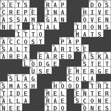 ACROSS 1. Arranges properly for use 5. Strike 8. Two (Sp.) 11. Streamer paper 13. _ tizzy (2 wds.) 14. Hub of activity 15. Indian state 16. Separate the seeds from cotton 17. Baking chamber 18. Remaining after all deductions 19. Slanted text style (abbr.) 21. Removes the wrinkles 22. "Tell ____ the Marines!" 24. Floor protectors 25. Buttonhole 27. Infant food 29. Table seasoning 30. Get up 32. Length times width 33. Having ears or earlike features 35. "____ silly question..." 39. Inn 41. Proofreading order 42. Purpose 43. Develop 45. Volcanic refuse 48. Root beer relative 49. Box-office sellout 50. Parka part 52. Three (prefix) 55. Periodic rise and fall of the sea level 56. Cartoonist voice _ Blanc 57. Keyboard key 59. Silent film actress Nazimova 60. Actress Charlotte 61. Biscuitlike quick bread 62. Born 63. Wedding promise 64. Singles DOWN 1. Skim 2. Celtic language 3. One of the two male reproductive glands 4. Health resort 5. Capital of Latvia 6. Of or related to the anus 7. Baking dish 8. A piece of turf (Scot.) 9. Baking chambers 10. Elected reps. 12. Sends forth 14. Israeli folk dance 20. Small child 21. Naughty children 23. Add up to 25. White ___ sheet 26. Automobile 27. Before (prefix) 28. Assist 30. "We ___ not amused" (Victoria) 31. Artist's stand 33. Begley and Asner 34. Personal question 36. Ski resort town in Vermont 37. Barrel 38. Had dinner 40. Ending for "Through" and "Enough" 43. Environmental prefix 44. Methods 45. Grin 46. Dipping utensil 47. Toward the sea 49. Comedian Laurel of Laurel & Hardy 50. Froth on beer 51. Margarine 53. French philosopher Descartes 54. Angers 56. Medical imaging device (abbr.) 58. Non-commissioned officer (abbr.)