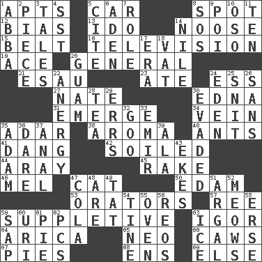 ACROSS 1. Tenement units (abbr.) 5. Automobile 8. Specific locale 12. Prejudice 13. Wedding promise 14. Trap for birds or small mammals 15. Waist strap 16. Household entertainment appliance 19. Adept person 20. Commissioned military rank 21. Son of Isaac 23. Had dinner 24. Curvy letter 27. Nathan's nickname 30. Pulitzer Prize-winning author Ferber 31. Develop 34. Distinctive style or manner 35. The sixth month of the Jewish calendar 38. Scent 40. Pismires 41. Mild oath, euphamism for damn 42. Dirtied 44. Like ___ of sunshine 45. Libertine 46. Cartoonist voice _ Blanc 47. Feline 50. Dutch treat 53. Speakers 57. To sift 59. Supplementary 63. Russian composer Stravinsky 64. N. Chile seaport 65. Modern: prefix 66. Crow sounds 67. Sliced desserts 68. Followers of ems 69. Otherwise DOWN 1. Swedish rock group 2. Component 3. Stories 4. Fast jet (abbr.) 5. Quote 6. An important port of Yemen 7. Hero or heavy, e.g. 8. Mayday 9. Luau course 10. Bear (Spanish) 11. Nine, plus one 14. The longest river in the world 17. Period 18. Large container 20. Island territory of the United States 22. Disorder of the immune system 24. Genesis locale 25. In a ____ (agitated or irritated) 26. Without 28. Afternoon social gathering 29. Blunders 30. Dodged 32. Thick or sticky substance 33. Arab leader 35. First man 36. Have the gumption 37. Of or related to the anus 39. Chicken ___ king 43. Supplements with great effort 47. Root beer relative 48. "We ___ not amused" (Victoria) 49. Make lace 51. Therefore, facetiously 52. Catcalls? 54. Prong on a fork 55. Baking chamber 56. Vintage cars 58. Celtic language 59. Plant excrement 60. RI univ. 61. Sliced dessert 62. Personal Computers (abbr.) 63. Frozen water