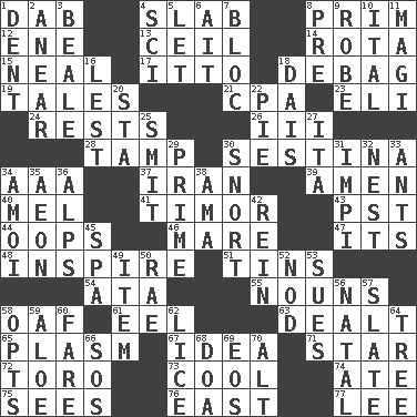 ACROSS 1. Small moist lump or mass 4. Broad, flat, thick piece 8. Demure 12. Compass dir. 13. To provide with a ceiling 14. Roll call or roster of names 15. Actress Patricia 17. "Tell ____ the Marines!" 18. Debunk (Brit. slang) 19. Lies 21. Numbers guy (abbr.) 23. Connecticut Ivy Leaguer 24. Musical pauses 26. One more than two 28. Pack (down) 30. French poetic form 34. Auto club (abbr.) 37. SW Asia republic 39. So be it 40. Cartoonist voice _ Blanc 41. Southeast Indonesia island 43. Pacific Standard Time (abbr.) 44. I made a mistake 46. Female horse 47. It is 48. Stimulate to action 51. Metal containers 54. _ moment's notice (2 wds.) 55. Parts of speech 58. Clumsy lout 61. Snakelike fish 63. Started a card game 65. Suffix with ecto or cyto 67. The content of cognition 71. Play the lead 72. "Corrida" creature 73. Calm and collected 74. Had dinner 75. Observes 76. Compass direction 77. Area sheltered from the wind DOWN 1. Gouge 2. Approach 3. Memphis, Tenn. Street 4. _-fi 5. Allow 6. Small island 7. Group of countries in special alliance 8. Before (prefix) 9. Loose flowing garment 10. Slanted text style (abbr.) 11. Wise men 16. For fear that 18. Raised platform 20. R.R. building 22. Sliced dessert 25. Stricken, poetically 27. Call ___ day 29. A-one 30. Derisive sound 31. Body of Kaffir warriors 32. Egg locale 33. Pismires 34. Mine, in Marseilles 35. A really long time 36. High mountains 38. Wet nurse (var.) 42. It's straight from the horse's mouth 45. Health resort 49. Detail 50. Actress Charlotte 52. Allow head to fall sleepily 53. Takes to court 56. Relating to or accompanying birth 57. Chalkboard 58. Chooses 59. _ vera 60. Conductor's collection 62. Louse (plural) 64. Relationship diagram 66. Distress signal 68. ___ good deed 69. Greek goddess of the dawn 70. Keyboard modifier key