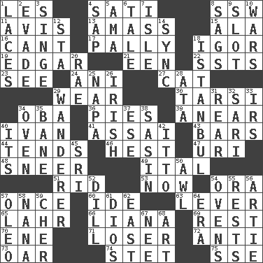 ACROSS 1. French article 4. Suttee (variant) 8. Compass dir. 11. Opinion 13. Collect or gather 15. According to 16. Patter 17. Friendly 18. Russian composer Stravinsky 19. _ Allan Poe 21. Car or cant ending 22. Fast planes 23. Observe 24. Cuckoo 27. Feline 29. Erode 30. Tarsus (plural) 34. Chief or king in Benin or Nigeria 36. Sliced desserts 39. Approach 40. _ the terrible 41. Slender Brazilian palm 43. Soap units 44. Watches over 46. Command 47. RI univ. 48. Contemptuous expression 49. Slanted text style (abbr.) 51. To free from 53. At this time 54. Mouth or opening 57. Single time 60. Binary compound 63. Crowbar 65. Cowardly lion portrayer 66. Woody, climbing, usually tropical plant 69. Respite 70. Compass dir. 71. Failure 72. Against 73. Rowing implement 74. Proofreading order 75. Compass dir. DOWN 1. Shoestrings 2. Dodge 3. Burn superficially 4. Plant excrement 5. Wet nurse (var.) 6. Falsehood 7. Small island 8. Settles 9. Narrow, elongated depression 10. Armed conflicts 12. R.R. building 14. Synchronize (abbr.) 18. Byzantium, centuries later 20. Actress Charlotte 25. California wine valley 26. From or relating to Ireland 28. "One Day ___ Time" 29. Nomad 31. Stern 32. Indian skirt 33. Big collection agency 34. Baking chamber 35. Object of repulsion 37. Compass dir. 38. Indian antelope 40. It is 42. "Tell ____ the Marines!" 45. Indian title of respect (Mr.) 50. Leather borer 52. Deli pickle 54. Baking chambers 55. Musical pauses 56. Nick name for Arthur 57. Butter sub 58. Nanny 59. "Mermaids" star 61. "Vaya con ____" 62. Compass direction 64. Epoch 67. Born 68. Nonscientific branch of learning