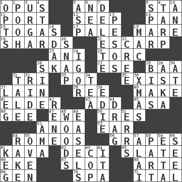 ACROSS 1. Musical composition 5. Added to 8. R.R. building 11. Sweet dark-red dessert wine 12. Ooze 14. Baking dish 15. Ancient Roman robes 17. Light colored 18. Female horse 19. Pottery fragments 21. Fortification 23. Cuckoo 25. Torque (variant) 26. Heroin 27. Compass dir. 28. Sound made by sheep 31. Three (prefix) 33. Cooking vessel 35. Be 37. (Had) reclined 38. Portuguese money of account (variant) 40. Cause to be 41. A person who is older than you are 43. Increase 45. White ___ sheet 46. Unit of force equal to gravity 47. She-sheep 50. Angers 52. Small Philippine buffalo 53. Ewer handle 54. Lover boys 56. Wine fruits 61. Polynesian shrub of the pepper family 62. Tenth: prefix 65. Chalkboard 66. Make supply last 67. Narrow opening 68. Johnson of "Laugh-In" 69. Commissioned military rank (abbr.) 70. Health resort 71. Slanted text style (abbr.) DOWN 1. Elects 2. "Silly old bear" 3. Capital and largest city of Mongolia 4. Play the lead 5. Viper 6. Teachers' org. 7. Keyboard key 8. Coast Guard woman 9. Canvas cover 10. One (Scot) 13. Mexican monetary units 16. Neighbor of Neb. 18. Big _ 20. Fastener 22. Algonquian 24. Russian composer Stravinsky 26. Trig term 28. Prejudice 29. "____ silly question..." 30. Had dinner 31. Falsehood 32. Travel on an animal 34. Afternoon social gathering 36. Dec. holiday 37. Part of a journey 39. Singer Brickell 42. French philosopher Descartes 44. To trail on the ground 48. Forest 49. Artist's stands 51. Blunders 52. Nanny (var.) 54. Immoral or dissolute person 55. Baking chamber 57. Mountain range southwest of Kyrgyzstan 58. Role in a play 59. Singer James 60. Stitch closed the eyes of (a falcon) 61. Cask 63. Police officer (slang) 64. Call ___ day
