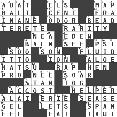 ACROSS 1. Blind as ____ 5. Raised railways 8. Atlas unit 11. Indonesian resort city 12. Penny 14. Epoch 15. Empty; void 17. Scent 18. Necklace unit 19. Cigar-shaped 21. Noteworthy scarcity 23. Teachers' org. 25. Genesis locale 26. Lip ointment 27. Observe 28. Air pressure measure (abbr.) 31. "Barney Miller" actor Jack 33. Male offspring 35. Watery 37. "Tell ____ the Marines!" 38. Electrically charged atom 40. Medicinal plant 41. Taiwanese island in East China Sea 43. Strike 45. Layer 46. Adept person 47. Born 50. Fly high 52. Comedian Laurel of Laurel & Hardy 53. Coat; cloak 54. Buttonhole 56. Aide 61. Jai _ 62. One of the Great Lakes 65. Gospel singer Marvin 66. Set 67. Allows 68. Connect, as a bridge 69. Snakelike fish 70. Ingest 71. Drawn tight DOWN 1. "This won't hurt ____!" 2. Object of repulsion 3. Having or resembling wings 4. Prong on a fork 5. Environmental prefix 6. Directed 7. Sounds asleep 8. Rendezvous 9. Like ___ of sunshine 10. Groovy apt. 13. Exchange 16. Inactive volcano in Sicily 18. Storage container 20. Snakelike fish 22. Coral collection 24. Mine, in Marseilles 26. Scornful sounds 28. Whimper 29. The Jewish people; Israel 30. Binary compound 31. Play the lead 32. Von Bismarck 34. And not 36. Cowardly lion portrayer 37. Mischievous child 39. Political cartoonist Thomas 42. To (old English) 44. "Silly old bear" 48. Artist's stand 49. Main course 51. Eons 52. _-fi 54. Toward shelter 55. Give a ring to 57. For fear that 58. Dad 59. Son of Isaac 60. Monthly bill 61. Grow older 63. Call ___ day 64. Eastern Standard Time (abbr.)
