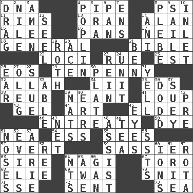 ACROSS 1. Heredity factor (abbr.) 4. Corncob 8. 23rd letter of the Greek alphabet 11. Basketball hoops 13. NW Algerian seaport 14. ____ Jay Lerner 15. Toward shelter 16. Zero-star reviews 17. Famous astronaut Armstrong 18. Commissioned military rank 21. Instruction Manual for Humans 22. Event scenes 23. Sorrow 25. Eastern Standard Time (abbr.) 26. Greek goddess of the dawn 29. 3-inch nail 32. Assad's deity 34. Cards in a Roman deck? 35. Begley and Asner 38. Reuben's nickname 39. Intended 41. Central Nebraska county 43. Set 44. Tate display 45. A person who is older than you are 46. Plea 50. Color 51. Teachers' org. 54. Curvy letter 55. Perceives with the eye 57. Unconcealed 59. More disrespectful 63. Father 64. Wise men 67. "Corrida" creature 68. Writer Wiesel 69. It was, poetically 70. In a ____ (agitated or irritated) 71. Compass dir. 72. Emitted 73. Ocean DOWN 1. To be drawn or hauled along 2. "Death on the ____" 3. So be it 4. Cotton for raincoats, e.g. 5. Retirement account (abbr.) 6. Baking dish 7. Followers of ems 8. Cadet 9. Moves on water 10. An arm off of a larger body of water 12. Sew up the eyelids of hawks and falcons 14. Black tropical American cuckoo 19. Writer of Portnoy's Complaint (1969) 20. Adept person 21. Benjamin's nick name 23. It's straight from the horse's mouth 24. A single undivided whole 26. Hearing organ 27. Cassini of fashion 28. Change direction abruptly 30. Food holder 31. Shout 33. Competent 36. Texas town _ City 37. Chop _ 39. Floor coverings 40. Blunders 42. Before (prefix) 45. Snake ____ (dice throw) 47. Remaining after all deductions 48. Aid 49. Afternoon social gathering 51. Olfactory organs 52. Vices 53. Nest on high 56. Fast planes 58. To riddle 60. Charged particles 61. One of the Great Lakes 62. Round or rotation of duties 64. Mountains (abbr.) 65. Deep reverence 66. Separate the seeds from cotton