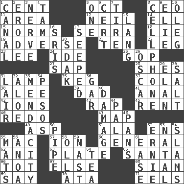 ACROSS 1. Penny 5. Sep. follower 8. Corporate head (abbr.) 11. Length times width 12. Famous astronaut Armstrong 14. Pipe bend 15. Typical models 17. Father Junipero _ 18. Falsehood 19. Contrary to your interests or welfare 21. "___ Little Indians" 22. Part of a journey 23. Area sheltered from the wind 24. Binary compound 25. Republican Party 27. Plant excrement 28. "______ My Girl" (Turtles hit) 31. Desk light 35. Barrel 37. Root beer relative 38. Toward shelter 39. June honoree 41. Of or related to the anus 42. Charged particles 43. Strike 45. Monthly bill 46. Make new 47. Atlas unit 49. Viper 51. In the manner of 52. Followers of ems 55. Apple computer (short form) 57. Electrically charged atom 60. Commissioned military rank 62. Cuckoo 63. Food holder 65. Before Barbara or Clara 66. Small child 67. Otherwise 68. Thailand, formerly 69. Declare 70. _ moment's notice (2 wds.) 71. Snakelike fish DOWN 1. Lessep's creation 2. Eat (away) 3. Effrontery 4. Docile 5. Single 6. Foregone conclusion 7. Become fatigued 8. Portable communications device 9. Writer Wiesel 10. Cassini of fashion 13. Long (Scottish) 16. Indian titles of respect 17. Oozed 20. Neighbor of Neb. 26. Motion picture award 29. Liveliness 30. Table seasoning 31. Den 32. Medicinal plant 33. Ananias' fault 34. Mexican monetary units 36. Slender fish 40. Break 44. Diluted with white 48. Baking dishes 50. Corncob 52. Bert's buddy 53. Relating to or accompanying birth 54. Criticizes harshly 55. Floor protectors 56. Small Philippine buffalo 58. Rounded earthenware pot or jar 59. Political cartoonist Thomas 61. Comfort 64. Afternoon social gathering