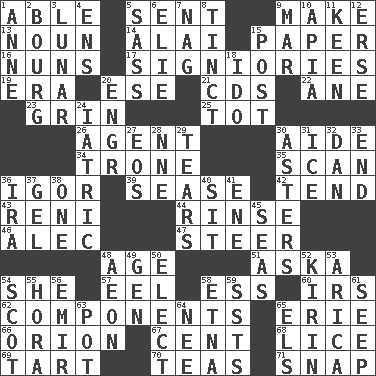 ACROSS 1. Competent 5. Transmitted 9. Create 13. Part of speech 14. Jai ____ 15. Some stationery 16. Religious women 17. Seigniories (variant) 19. Epoch 20. Compass dir. 21. Music discs 22. A saturated hydrocarbon 23. Smile widely 25. Small child 26. Rep 30. Helper 34. Marketplace scale 35. Glance over 36. Composer Stravinsky 39. Gospel singer Marvin 42. Be inclined (to) 43. Painter Guido (1575-1642) 44. Wash lightly 46. Actor Baldwin 47. Bull 48. Mature 51. "____ silly question..." 54. A female animal or person 57. Snakelike fish 58. Double-curved letter 60. Big collection agency 62. Pieces 65. One of the Great Lakes 66. Constellation of myth 67. Penny 68. Louse (plural) 69. Small pie 70. Beverages made from leaves 71. Fastener DOWN 1. Queen of England 1702-14 2. Town 3. Type of eclipse 4. Followers of ems 5. Backtalk 6. Writer Wiesel 7. Tired old horse 8. A color or tint 9. Make imperfect 10. Capital of Western Samoa 11. Peachy ____! 12. Celtic language 15. Mail 18. Wedding promise 20. Engineer (abbr.) 24. Of or pertaining to medicine 27. Greek goddess of the dawn 28. Compass dir. 29. Separates forcefully 30. Michaelmas daisies 31. Frozen water 32. Daniel's nick name 33. Conclude 36. Lyricist Gershwin 37. Set 38. Single 40. Be seated 41. Compass dir. 45. Oceans 48. Period of immesurable duration 49. Commissioned mil. rank 50. Opt 52. Japanese brewing company 53. N. Chile seaport 54. Native of Scotland 55. Israeli folk dance 56. Arab leader 58. Inactive volcano in Sicily 59. Fast planes 61. Ooze 63. Plant holder 64. Born 65. Raised railways