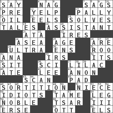 ACROSS 1. Declare 4. Tired old horse 7. Settles 11. Before (prefix) 12. Sharp bark 13. Friendly 14. Petroleum 15. Snakelike fish 16. Finds the solution 17. Lies 19. Aide 21. "One Day ___ Time" 23. Angers 24. At sea 25. Grow older 26. "We ___ not amused" (Victoria) 29. Extreme 30. Followers of ems 31. Friend of Pooh 32. Santa ___, CA 33. Big collection agency 34. It is 35. Be seated 36. _-fi 37. Pale purple color 40. Had dinner 41. Area sheltered from the wind 42. At once, immediately (arch.) 43. Skim 45. Writing tablet 46. Making a chance decision by using lots 51. Sibling's daughter 55. Foolish or stupid persons 56. Docile 58. Part of a journey 59. Having high moral qualities 60. Russian ruler of old 61. One more than two 62. Celtic language 63. Baseball player Mel 64. Raised railways DOWN 1. Blemish 2. Operatic vocal solo 3. Shout 4. Born 5. Silent film actress Nazimova 6. Global Positioning Systems (abbr.) 7. Table seasonings 8. Inventor's middle name 9. Small, secluded valley 10. System (abbr.) 12. Next before 13. Introduce or present, as a question 16. Begets 18. Compass direction 20. Omens 22. American Automobile Association (abbr.) 24. Having winglike extensions 25. Nest on high 26. Believer in; advocate of (suffix) 27. College mil. group 28. Greek goddess of the dawn 29. A single undivided whole 32. White ___ sheet 33. Ancient Celtic tribe of eastern Britain 36. Narrow boards 37. Infant locale 38. Sillier 39. Farming town in central California 43. Took without asking 44. Quote 46. Trig term 47. Aroma 48. Chest bones 49. Von Bismarck 50. Political cartoonist Thomas 52. Writer Wiesel 53. To provide with a ceiling 54. The front part of a cuirass 57. Floor covering