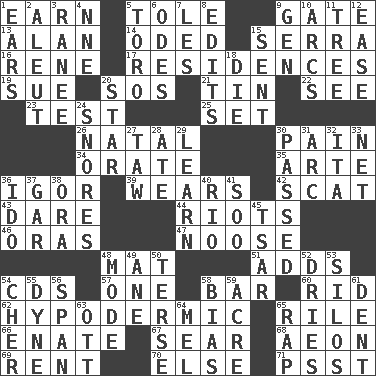 ACROSS 1. Merit 5. Lacquered or enameled metalware 9. Yard entry 13. ____ Jay Lerner 14. Wrote a lyric poem 15. Spanish missionary in California 16. French philosopher Descartes 17. Homes 19. Take to court 20. Mayday 21. Metal container 22. Perceive with the eye 23. Trial 25. Arrange properly for use 26. Brizilian seaport 30. Ache 34. Declaim 35. Johnson of "Laugh-In" 36. Composer Stravinsky 39. Erodes 42. Go away! 43. Have the gumption 44. Disturbances 46. Mouths or openings 47. Trap for birds or small mammals 48. Floor covering 51. Does sums 54. Music discs 57. Single 58. Drinking establishment 60. To free from 62. Below the epidermis 65. Cause heat under the collar 66. Related on the mother's side 67. Dry up 68. A really long time 69. Monthly bill 70. Otherwise 71. Inconspicuous attention getter DOWN 1. Hearing organs 2. Eskimo relative 3. The wife of a rajah (variant) 4. Compass dir. 5. "Corrida" creature 6. Lyric poems 7. French article 8. Proofreads 9. Commissioned military rank (abbr.) 10. Curves 11. Woody plant 12. Relaxation 15. Posted 18. Pass on 20. Play the lead 24. Sounds asleep 27. The 23rd letter of the Hebrew alphabet 28. Had dinner 29. Memorize 30. Went by 31. Curve 32. Call ___ day 33. Fish or hair follower 36. Wedding promise 37. Slender fish 38. Mouth or opening 40. River (Sp.) 41. "Barney Miller" actor Jack 45. Russian ruler of old 48. Method 49. A saturated hydrocarbon 50. Laconic 52. Frees from moisture 53. Grain storage towers 54. "Mermaids" star 55. Unit of force 56. Connect, as a bridge 58. Prejudice 59. 1/640 square mile 61. Undesirable depression on a surface 63. Baseball player Mel 64. Cartoonist voice _ Blanc 65. Reproach for some lapse or misdeed