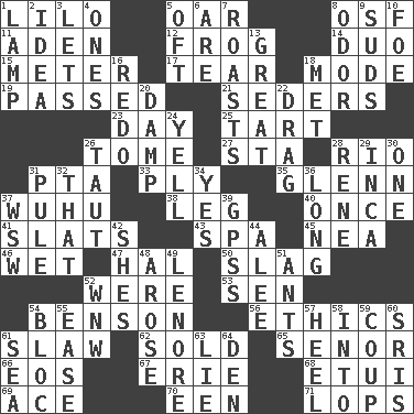 ACROSS 1. _ and Stitch 5. Boat paddle 8. Order of Saint Francis (abbr.) 11. Arabian gulf 12. Toadlike animal 14. Superhero pair 15. Distance measurement 17. Rend 18. Method 19. Went by 21. Spring feasts 23. 24 hours 25. Small pie 26. Heavy book 27. R.R. building 28. _ de Janeiro 31. Parent Teacher Association (abbr.) 33. Travel a route regularly 35. American astronaut and politician John 37. Chinese city south-southwest of Nanjing 38. Part of a journey 40. Single time 41. Narrow boards 43. Health resort 45. Teachers' org. 46. Soggy 47. Actor Linden 50. Volcanic refuse 52. Past tense of be (plural) 53. Elected rep. 54. Gillaume's butler role 56. Value system 61. Cole _ (cabbage dish) 62. Exchanged or delivered for money 65. Sir (Sp.) 66. Greek goddess of the dawn 67. One of the Great Lakes 68. Needle case 69. Adept person 70. Car or cant ending 71. Chops off DOWN 1. Desk light 2. The content of cognition 3. Allows 4. Singles 5. Often (poetically) 6. "We ___ not amused" (Victoria) 7. Cooks with dry heat, as in an oven 8. Scent 9. Soap bubbles 10. Enemy 13. Relatively large 16. Do over again 18. Was introduced to 20. Moist 22. To be drawn or hauled along 24. Shout 26. Strained 28. French philosopher Descartes 29. South American Indian 30. Single 31. Whine 32. Not this but _ 34. Affirmative reply 36. Protracted 37. Compass dir. 39. Global Positioning Systems (abbr.) 42. "______ My Girl" (Turtles hit) 44. Toward shelter 48. Came up 49. Poe poem 51. Pismires 52. Compass dir. 54. Alliance 55. Comfort 57. The bottom of a shoe or boot 58. To the inside or interior of 59. Clever action or accomplishment 60. Indian titles of respect 61. Ocean 63. Falsehood 64. Lair