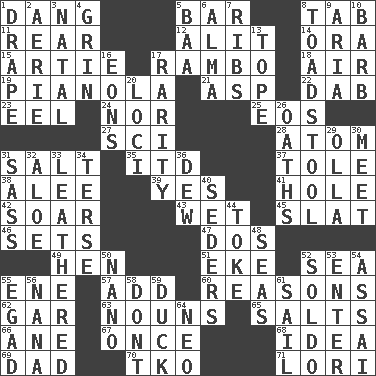 ACROSS 1. Mild oath, euphamism for damn 5. Soap unit 8. Keyboard key 11. Posterior 12. Came down and settled, as after flight 14. Mouth or opening 15. Nick name for Arthur 17. Role for Stallone 18. Atmosphere 19. Player piano 21. Cleo's killer 22. Pat or tap gently 23. Snakelike fish 24. Not either 25. Greek goddess of the dawn 27. _-fi 28. Tiny particle 31. Table seasoning 35. It would 37. Lacquered or enameled metalware 38. Toward shelter 39. It is so 41. Opening into or through something 42. Fly high 43. Dripping 45. Narrow board 46. Arranges properly for use 47. Two (Sp.) 49. Layer 51. Make supply last 52. Ocean 55. Compass dir. 57. Increase 60. Thinks logically 62. Slender fish 63. Parts of speech 65. Table seasonings 66. One (Scot) 67. Single time 68. The main thing one is thinking about 69. June honoree 70. Ring climax 71. Australian parrot (variant) DOWN 1. Window treatment 2. Nest on high 3. Relating to or accompanying birth 4. Broad smile 5. Sound made by sheep 6. _ mater 7. Teases 8. Inedible or poisonous agaric 9. Roberta Peters solo 10. Sharp remark 13. Drink excessively 16. Immeasurably long periods of time 17. Noteworthy scarcity 20. Event scenes 26. Curses 29. Spanish pot 30. Rendezvous 31. Backtalk 32. _ vera 33. Resembling or made to resemble leather 34. Laconic 36. Morning condensation 40. Spring feasts 44. Puff or smoke 48. Oceans 50. Billionth: prefix 52. Twentieth part of a lira 53. Keyboard key 54. Slender Brazilian palm 55. Mild oath 56. Nanny 58. Do not 59. Evade 61. Move on water 64. Modern: prefix