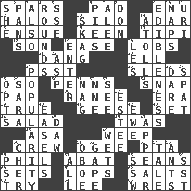 ACROSS 1. Practice fights 6. Groovy apt. 9. Australian flightless bird 12. Rings 13. Grain storage tower 14. The sixth month of the Jewish calendar 15. Take place subsequently 16. Peachy ____! 17. Native american tent (variation) 18. Boy, to dad 19. Relaxation 20. Tennis shots 21. Mild oath, euphamism for damn 23. Pipe bend 24. Inconspicuous attention getter 25. Bobsleighs 28. Bear (Spanish) 30. Actor Sean's family 34. Fastener 35. Infant food 36. The wife of a rajah (variant) 38. Epoch 39. Loyal 41. Honkers 43. Put into a specified state 44. Vegetable dish 46. It was, poetically 48. White ___ sheet 49. Shed a tear 50. Ship's personnel 51. Double curve, resembling the letter S 53. Parent Teacher Assoc. 56. Silvers or Donahue 57. Blind as ____ 58. Actors Connery and Penn 60. Puts into a specified state 61. Chops off 62. Table seasonings 63. Attempt to accomplish something 64. Area sheltered from the wind 65. Obtain by seizing forcibly or violently DOWN 1. A female animal or person 2. Zero-star reviews 3. In addition 4. Periods in a boxing match 5. Compass dir. 6. Sliced desserts 7. Toward shelter 8. Spanish title 9. The property of being fit to eat 10. Atlas contents 11. RI univ. 13. Heroin 14. Ringlike coral islands and reefs 19. Keyboard key 20. French article 22. Cleo's killer 24. Teen's desire 26. Have the gumption 27. Argument over a trivial matter 28. Chooses 29. "Two Mules for Sister ____" 31. Tired old horse 32. Compass dir. 33. Perceive with the eye 37. First name in cosmetics 40. Artist's stands 42. She-sheep 45. Simpleton 47. Become visible 49. Soaks 50. "Mermaids" star 51. Mitch Miller's instrument 52. Yawn 54. Lie 55. Pismires 56. Pacific Standard Time (abbr.) 57. 100% 58. Compass dir. 59. Fast jet (abbr.)
