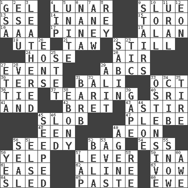 ACROSS 1. Set 4. Type of eclipse 9. Turn sharply 13. Compass dir. 14. Empty; void 15. "Corrida" creature 16. American Automobile Association (abbr.) 17. Abounding in pines 18. ____ Jay Lerner 19. Shoshoni 21. The 23rd letter of the Hebrew alphabet 22. Free of sound 24. Stockings 26. Atmosphere 27. Happening 29. Lettered men learn these first 30. Laconic 31. Indonesian resort city 33. Sep. follower 36. Neckwear 37. Rending 40. Indian title of respect (Mr.) 41. Added to 42. Cy Young winner Saberhagen 43. Having gotten out of bed 45. Messy guy 47. Military trainee 48. Car or cant ending 49. A really long time 50. Full of seeds 52. Paper or plastic container 54. Curvy letter 56. Sharp bark 57. Prying instrument 59. _ tizzy (2 wds.) 61. Comfort 62. Place in a line 63. Solemn pledge 64. Downhill vehicle 65. Thick mixture 66. She-sheep DOWN 1. Girls' org. (abbr.) 2. He sold his birthright 3. Tough but pliablecoriaceous 4. Mouth edge 5. Join together 6. Grandmother 7. Afresh 8. Marina Del _, California 9. Flight of steps 10. Hang loosely or laxly 11. Mountain range 12. A really long time 20. Immeasurably long periods of time 22. Unit of acoustic absorption 23. Nervous spasm 25. Proofreading order 27. Singer James 28. Distinctive style or manner 29. Came down and settled, as after flight 31. Sharp remark 32. "We ___ not amused" (Victoria) 33. Clearly or manifestly demonstrative 34. Baby bed with high sides 35. Become fatigued 38. Black 39. Stare wonderingly 44. A type of plum 45. Oozed 46. Directed 49. Rep 50. Lick closed 51. Otherwise 52. Actor Lugosi 53. Deliberation 55. Overwhelm 56. Affirmative reply 57. Infant locale 58. To separate or throw off 60. Deep reverence