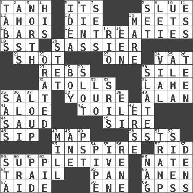 ACROSS 1. Hyperbolic tangent 5. It is 8. Change direction abruptly 12. Mine, in Marseilles 13. Expire 14. Confronts 15. Soap units 16. Pleas 19. Fast jet (abbr.) 20. More lively and spirited 21. Attempt 23. Single 24. Large container 27. Confederate soldiers (slang) 30. Drop; flow; fall 31. Ringlike coral islands and reefs 34. Unable to walk 35. Table seasoning 38. You are 40. Actor Alda or Thicke 41. _ vera 42. Rest room 44. Saudi Arabian king (1953-1964) 45. Male parent of an animal 46. Small drink 47. Atlas unit 50. Fast planes 53. Heighten or intensify 57. To free from 59. Supplying deficiencies 63. Nathan's nickname 64. Lag or linger behind 65. Baking dish 66. So be it 67. Assistant 68. Compass dir. 69. Global Positioning Systems (abbr.) DOWN 1. Bar bills 2. Collect or gather 3. Compass direction 4. Part of HMS, perhaps 5. It may be bright or harebrained 6. Airtight sealed metal containers 7. Arranges properly for use 8. Arrange properly for use 9. Luau accessory 10. Shoshoni 11. Curvy letter 14. Female horse 17. _ de Janeiro 18. Car or cant ending 20. Proofreading order 22. Spoke pompously 24. Small bottle 25. _ mater 26. Adolescent 28. Male child 29. Position in a hierarchy or organization 30. Chalkboards 32. Nilotic language 33. Indian titles of respect 35. Backtalk 36. Mountain range southwest of Kyrgyzstan 37. Central Nebraska county 39. Biblical high priest 43. Celtic language 47. Place where flour is made 48. One (Scot) 49. Pacific Standard Time (abbr.) 51. _____ steamer (cargo ship) 52. Locates 54. Corncob 55. _ the terrible 56. French philosopher Descartes 58. Habitations of wild animals 59. R.R. building 60. RI univ. 61. Writing tablet 62. Sliced dessert 63. Tired old horse