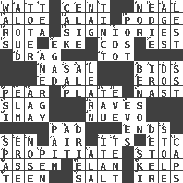 ACROSS 1. Electrical Unit 5. Penny 9. Actress Patricia 13. Medicinal plant 14. Jai ____ 15. Porridge 16. Roll call or roster of names 17. Seigniories (variant) 19. Institute legal proceedings 20. Supplement with great effort 21. Music discs 22. Eastern Standard Time (abbr.) 23. To draw with force 25. Small child 26. Relating to the nose 30. Auction offers 34. Peak District village in England 35. Greek god of love 36. Lightbulb-shaped fruit 39. Food holder 42. Political cartoonist Thomas 43. Volcanic refuse 44. All-night dance parties 46. "If ____ say so..." 47. New (sp.) 48. Groovy apt. 51. Extremities 54. Elected rep. 57. Wind 58. It is 60. And so on (abbr.) 62. Appease 65. Portico 66. NE Netherlands city 67. Enthusiasm 68. Seaweed 69. Adolescent 70. Table seasoning 71. Angers DOWN 1. Armed conflicts 2. Verbally 3. Carrier 4. Beverage made from leaves 5. Keg 6. Writer Wiesel 7. Tired old horse 8. A color or tint 9. Not either 10. Singer Brickell 11. Ripens 12. For fear that 15. Mail 18. Wedding promise 20. Mild oath 24. Disorder of the immune system 27. Plant excrement 28. 100% 29. Acquire or gain knowledge or skills 30. Gillaume's butler role 31. Retirement account (abbr.) 32. Two (Sp.) 33. Fast jet (abbr.) 36. Air pressure measure (abbr.) 37. Shade tree 38. Auto club (abbr.) 40. The 19th letter of the Greek alphabet 41. First lady 45. Nights before holidays 48. Ache 49. Small island 50. Frees from moisture 52. Prevent from occurring 53. Fur scarf 54. Argument over a trivial matter 55. Celtic language 56. Sense of smell 58. Slanted text style (abbr.) 59. Portable shelter 61. Smile enhancers 63. Writing instrument 64. Wing 65. What Jean-Claude Killy likes to do