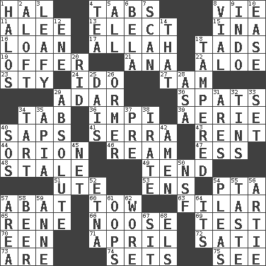 ACROSS 1. Actor Linden 4. Bar bills 8. Compete 11. Toward shelter 13. Voters do this 15. _ tizzy (2 wds.) 16. Grant temporary use of 17. Assad's deity 18. Small boys 19. Auction bid 21. Santa ___, CA 22. _ vera 23. Filthy place 24. Wedding promise 27. Scottish cap 29. The sixth month of the Jewish calendar 30. Arguments over trivial matters 34. Keyboard key 36. Body of Kaffir warriors 39. Nest on high 40. Plant excrements 41. Spanish missionary in California 43. Monthly bill 44. Greek mythologigal hunter 46. 480, 500 or 516 sheets of paper 47. Curvy letter 48. Lacking originality or spontaneity 49. Be inclined (to) 51. Shoshoni 53. Followers of ems 54. Parent Teacher Assoc. 57. Blind as ____ 60. Pull behind 63. Having threads 65. French philosopher Descartes 66. Trap for birds or small mammals 69. Trial 70. Car or cant ending 71. Showery time 72. Suttee (variant) 73. "We ___ not amused" (Victoria) 74. Arranges properly for use 75. Observe DOWN 1. Radiant circles of light 2. At or to great height 3. Like summer trees 4. Beverage made from leaves 5. 100% 6. Actor Lugosi 7. Skim 8. Small bottle 9. Southeast Asian peninsula 10. Comfort 12. Compass dir. 14. Not this but _ 18. ________ with (broke a safety seal) 20. To free from 25. Raised platform 26. Abalone 28. White ___ sheet 29. Utter; complete 31. Ancient Greek god of war 32. Metal containers 33. Arrange properly for use 34. Small pie 35. Capital of Western Samoa 37. Before (prefix) 38. Feeling or showing extreme anger 40. Distress signal 42. So be it 45. Remaining after all deductions 50. Science/research agcy. 52. Inactive volcano in Sicily 54. Entreaties 55. Clothes sense 56. Nick name for Arthur 57. Length times width 58. Fermented drink made from hops 59. Singer Murray 61. I made a mistake 62. Had on 64. ___ a Wonderful Life 67. Be seated 68. Raised railways