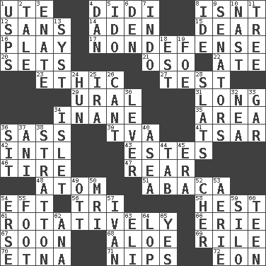 ACROSS 1. Shoshoni 4. "You Light Up My Life" star Conn 8. Is not 12. Without 14. An important port of Yemen 15. Letter starter 16. Frolic 17. Unrelated to defense, as in spending 20. Arranges properly for use 21. Bear (Spanish) 22. Had dinner 23. Moral principle 27. Trial 29. Mountain range 31. Protracted 34. Silly 35. Type of rug 36. Backtalk 39. Federal power corp. 41. Russian ruler of old 42. International (abbr.) 43. _____ Park, CO 46. Hoop that covers a wheel 47. Bring up, as a child 48. Tiny particle 51. Phillipine bananalike plant 54. Newt 56. Three (prefix) 58. Command 61. Producing rotation 66. 4th largest of the Great Lakes 67. Within a short period 68. Medicinal plant 69. Cause heat under the collar 70. Inactive volcano in Sicily 71. Cuts off 72. A really long time DOWN 1. United States Postal Service (abbr.) 2. Lie 3. Related on the mother's side 4. One of the 12 tribes of Israel 5. Wedding promise 6. Lair 7. Southeast Asian peninsula 8. Binary compound 9. Elected representatives 10. Political cartoonist Thomas 11. Family _ (genealogy) 13. System (abbr.) 18. Eastern Standard Time (abbr.) 19. Enemy 24. Attila the _ 25. Lyricist Gershwin 26. Patter 28. Narrow boards 30. Crowbar 32. Teachers' org. 33. Slender fish 34. Small island 36. Be seated 37. Black tropical American cuckoo 38. Ski resort town in Vermont 40. Toward the sea 44. Keyboard key 45. Period 49. Baseball player Mel 50. Medical imaging device (abbr.) 52. "Mermaids" star 53. Nest on high 54. Celtic language 55. Lowest support of a structure 57. _ the terrible 59. Grain storage tower 60. Adolescent 62. Santa ___, CA 63. Biblical high priest 64. Chop off 65. It is so