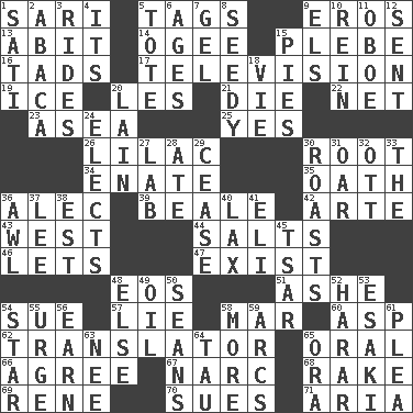 ACROSS 1. Indian skirt 5. Labels 9. Greek god of love 13. "This won't hurt ____!" 14. Double curve, resembling the letter S 15. Cadet 16. Small amounts or degrees 17. Household entertainment appliance 19. Frozen water 20. French article 21. Pass on 22. Remaining after all deductions 23. At sea 25. Consenting reply 26. Pale purple color 30. Carrot, for example 34. Related on the mother's side 35. Pledge 36. Actor Baldwin 39. Memphis, Tenn. Street 42. Johnson of "Laugh-In" 43. Compass direction 44. Table seasonings 46. Allows 47. Be 48. Greek goddess of the dawn 51. American tennis player Robert 54. Take to court 57. Falsehood 58. Make imperfect 60. Viper 62. Interpreter 65. Of the mouth 66. Match 67. Drug cop 68. Libertine 69. French philosopher Descartes 70. Institutes legal proceedings 71. Operatic vocal solo DOWN 1. Suttee (variant) 2. Phillipine bananalike plant 3. Amusement-park features 4. It is 5. Carry 6. Eons 7. Set 8. Shabby and untidy 9. Raised railways 10. It's straight from the horse's mouth 11. Mitch Miller's instrument 12. Transmitted 15. Sliced desserts 18. Compete 20. (Had) reclined 24. Chooses 27. Experiment locale 28. Had dinner 29. Desist 30. Cooks with dry heat, as in an oven 31. Boat paddle 32. Baseball player Mel 33. Definite Article 36. Leather borer 37. Area sheltered from the wind 38. Eastern Standard Time (abbr.) 40. Not strict 41. Connecticut Ivy Leaguer 45. Russian ruler of old 48. Otherwise 49. Petroleum 50. Seines 52. Ethiopian city, capital of Harari 53. 1973 Nobel Price Winner (Physics) Leo 54. Play the lead 55. Goad 56. Merit 58. Greater amount 59. Curves 61. Entreaty 63. Born 64. The 19th letter of the Greek alphabet 65. Mouth or opening