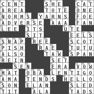 ACROSS 1. Penny 5. A female animal or person 8. Feline 11. Type of rug 12. Carryall 14. Single 15. Typical standards 17. Tall tales 18. Enemy 19. Contrary to your interests or welfare 21. Auto club (abbr.) 22. Air blower 23. Area sheltered from the wind 24. ___ a Wonderful Life 25. Shoshoni 27. Be seated 28. Snakelike fish 31. Fastener 35. To sift 37. Highlander 38. Expression of disdain 39. Actress Charlotte 41. Ballerina skirt 42. In addition 43. The 23rd letter of the Hebrew alphabet 45. Connect, as a bridge 46. It's straight from the horse's mouth 47. Put into a specified state 49. Elected rep. 51. Epoch 52. Promise 55. Floor protector 57. Chief or king in Benin or Nigeria 60. Small, flat, pigmented spot on the skin 62. Housemaid (var.) 63. Looks after 65. Phone greeting 66. Male offspring 67. Enthusiasm 68. Downhill vehicle 69. Teat (slang) 70. Wing 71. Small amounts or degrees DOWN 1. Lessep's creation 2. Wear away 3. Impudent aggressiveness 4. Not wild 5. R.R. building 6. Israeli folk dance 7. Inactive volcano in Sicily 8. Java holder (2 wds.) 9. Small Philippine buffalo 10. Adolescent 13. Son of Isaac 16. Indian titles of respect 17. Next before 20. Disorderly outburst 26. Trials 29. Globular water bottle used in Asia 30. Make senseless or dizzy 31. Coast Guard woman 32. "Death on the ____" 33. Helper 34. Give a jingle 36. Ingest 40. Artist's stands 44. Past tense of be (plural) 48. Hyperbolic tangent 50. Brief written record 52. Country estate 53. Stared 54. Forest 55. Vertical spar for supporting sails 56. Mine, in Marseilles 58. Actor Lugosi 59. Of or related to the anus 61. Trial 64. Heredity factor (abbr.)