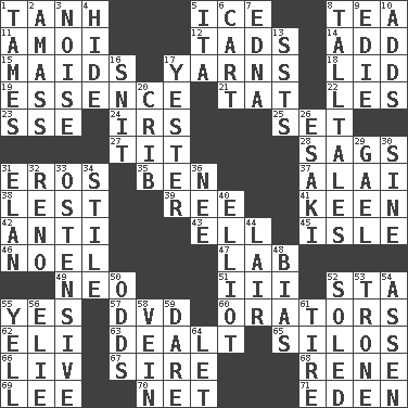 ACROSS 1. Hyperbolic tangent 5. Frozen water 8. Afternoon social gathering 11. Mine, in Marseilles 12. Small boys 14. Say or write further 15. Women servants 17. Tall tales 18. Hat (slang) 19. Substance 21. Make lace 22. French article 23. Compass dir. 24. Big collection agency 25. Arrange properly for use 27. Teat (slang) 28. Droops 31. Greek god of love 35. Benjamin's nick name 37. Mountain range southwest of Kyrgyzstan 38. For fear that 39. To sift 41. Peachy ____! 42. Opposed to 43. Pipe bend 45. Capri or Wight 46. Christmas carol 47. Experiment locale 49. Modern: prefix 51. One more than two 52. R.R. building 55. It is so 57. Movie disc 60. Speakers 62. Connecticut Ivy Leaguer 63. Started a card game 65. Grain storage towers 66. 54 in ancient Rome 67. Male parent of an animal 68. French philosopher Descartes 69. Area sheltered from the wind 70. Remaining after all deductions 71. Genesis locale DOWN 1. Domesticates 2. Collect or gather 3. Annoying sound 4. Flintstone garb 5. Call ___ day 6. Draw slowly or heavily 7. Pulitzer Prize-winning author Ferber 8. Baron Munchausen's specialties 9. Singer Brickell 10. Sums up 13. Fast planes 16. In a ____ (agitated or irritated) 17. Of or pertaining to yesterday 20. Baby bed with high sides 26. 1973 Nobel Price Winner (Physics) Leo 29. Highlander 30. Trig term 31. Style 32. Former U.S. Attorney General Janet 33. Clearly or manifestly demonstrative 34. Vertical member of a panel or frame 36. Born 40. American author Paul (1891-1958) 44. Den 48. Prejudice 50. Likelihood 52. Having a sole or soles 53. Heavy duty weighing machine 54. NE Netherlands city 55. Shout 56. Writer Wiesel 58. Distinctive style or manner 59. Have the gumption 61. Become fatigued 64. Allow