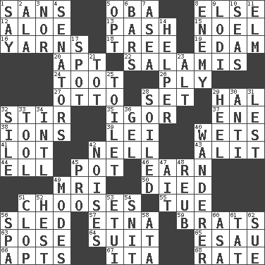 ACROSS 1. Without 5. Chief or king in Benin or Nigeria 8. Otherwise 12. _ vera 13. Romantic infatuation 15. Christmas carol 16. Entertaining tales 18. Woody plant 19. Dutch treat 20. Fitting 22. Deli grouping 24. A blast of a horn 26. Travel a route regularly 27. Von Bismarck 28. Put into a specified state 29. Actor Linden 32. Disorderly outburst 35. Composer Stravinsky 37. Compass dir. 38. Charged particles 39. Luau accessory 40. Soaks 41. Car dealer's back yard 42. 1994 drama film starring Jodie Foster 43. Set down 44. Pipe bend 45. Cooking vessel 46. Merit 49. Medical imaging device (abbr.) 50. Passed on 51. Elects 55. Third day of the wk. 56. Downhill vehicle 57. Inactive volcano in Sicily 59. Naughty children 63. Introduce or present, as a question 64. Set or collection 65. He sold his birthright 66. Flats, for short 67. Call ___ day 68. Pace DOWN 1. Declare 2. Insect wing 3. And not 4. Elected representatives 5. Elect 6. Oblong pieces of solid material 7. At sea 8. Foe 9. Farming town in central California 10. Oceans 11. Shade tree 14. Assistant 17. Blemish 21. Small child 23. Keyboard modifier key 25. Bathroom 28. Dirtied 29. Person who is morally reprehensible 30. Opposed to 31. For fear that 32. Drop; flow; fall 33. Utensil 34. International (abbr.) 36. Set 40. Roamer 42. Annoying sounds 45. Adept person 47. Small island 48. Reuben's nickname 49. Methods 51. Hoof sound 52. Behest 53. Needle case 54. In a ____ (agitated or irritated) 56. Health resort 58. "One Day ___ Time" 60. White ___ sheet 61. Make lace 62. Institute legal proceedings
