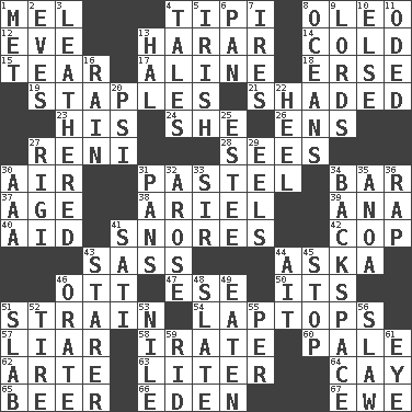ACROSS 1. Cartoonist voice _ Blanc 4. Native american tent (variation) 8. Margarine 12. First lady 13. Ethiopian city, capital of Harari 14. Having a low temperature 15. Pull into pieces 17. Place in a line 18. Celtic language 19. Paper fasteners 21. Cast a shadow over 23. Part of HMS, perhaps 24. A female animal or person 26. Followers of ems 27. Painter Guido (1575-1642) 28. Observes 30. Wind 31. Soft color 34. Tavern 37. Grow older 38. Satellite of Uranus 39. Santa ___, CA 40. Help 41. Sounds asleep 42. Police officer (slang) 43. Backtalk 44. "____ silly question..." 46. Baseball player Mel 47. Compass dir. 50. ___ a Wonderful Life 51. Put through a sieve 54. Portable computers 57. One who doesn't tell the truth 58. Feeling or showing extreme anger 60. Diluted with white 62. Johnson of "Laugh-In" 63. 61 cubic inches 64. Island 65. Fermented drink made from hops 66. Locale of original sin 67. She-sheep DOWN 1. Was introduced to 2. Nights before holidays 3. Tough but pliablecoriaceous 4. Stories 5. From or relating to Ireland 6. Baking dish 7. Angers 8. Seas 9. Titled peers of a realm 10. Otherwise 11. Wrote a lyric poem 13. Actor Linden 16. Water falling in drops from the sky 20. Air pressure measure (abbr.) 22. Person who is morally reprehensible 25. First name in cosmetics 27. Swiss mountan, "Queen of the Mountains" 29. Snakelike fish 30. American Automobile Association (abbr.) 31. Zero-star reviews 32. Came up 33. Title for a knight 34. Keyboard key 35. Small Philippine buffalo 36. Hit sharply and swiftly 41. Suttee (variant) 43. A viewer who gazes fixedly 44. Small island 45. Obstruct or block passage 46. Declaim 48. Chalkboard 49. Ingested 51. Broad, flat, thick piece 52. Hoop that covers a wheel 53. Mediterranean tributary 55. For each 56. Cole _ (cabbage dish) 59. To free from 61. Sight organ