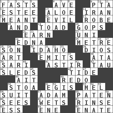 ACROSS 1. Goes without food and/or water 6. "___ Maria" 9. Parent Teacher Association (abbr.) 12. First name in cosmetics 13. _ vera 14. SW Asia republic 15. Intended 16. Tending to cause great harm 17. Loose flowing garment 18. Plus 19. Frog relative 20. Republicans 21. Merit 23. Single; one (prefix) 24. Pulitzer Prize-winning author Ferber 25. Distance measurement (Brit.) 28. Male child 30. Potato state 34. "Vaya con ____" 35. Tate display 36. Gives off 38. _ moment's notice (2 wds.) 39. Indian skirt 41. Moving about 43. The 19th letter of the Greek alphabet 44. Bobsleighs 46. Event that recurs at intervals 48. Small island 49. Make new 50. Portico 51. Armor plate that protects the chest 53. Cartoonist voice _ Blanc 56. Set or collection 57. First of billions? 58. Eucharist need 60. Observes 61. Moistens 62. Wash lightly 63. Curvy letter 64. Compass dir. 65. Maternal DOWN 1. Opposite of masc. 2. At sea 3. Comedian Laurel of Laurel & Hardy 4. Watched over 5. Arrange properly for use 6. Inventor's middle name 7. Empty area or space 8. Snakelike fish 9. Conciliate 10. Bar bills 11. One (Scot) 13. A really long time 14. Pressed 19. Buy and sell 20. Chewing product 22. Cuckoo 24. Pleas 26. Round or rotation of duties 27. Son of Isaac 28. Backtalk 29. Of the mouth 31. Nanny (var.) 32. Part of HMS, perhaps 33. Baseball player Mel 37. Settings 40. Foolish or stupid persons 42. To free from 45. R.R. building 47. Realm 49. Basketball hoops 50. Institutes legal proceedings 51. Genesis locale 52. Yard entry 54. Inactive volcano in Sicily 55. For fear that 56. Compass dir. 57. Deep reverence 58. Before (prefix) 59. Born