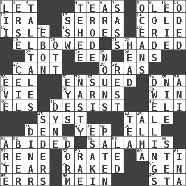 ACROSS 1. Allow 4. Beverages made from leaves 8. Margarine 12. Lyricist Gershwin 13. Father Junipero _ 14. Having a low temperature 15. Capri or Wight 17. Imelda's hoard 18. One of the Great Lakes 19. Shoved, as through a crowd 21. Cast a shadow over 23. Small child 24. Car or cant ending 26. Followers of ems 27. Patter 28. Mouths or openings 30. Snakelike fish 31. Took place subsequently 34. Heredity factor (abbr.) 37. Compete 38. Entertaining tales 39. Victory 40. Raised railways 41. Cease 42. Connecticut Ivy Leaguer 43. System (abbr.) 44. Lie 46. Lair 47. Slangy assent 50. Pipe bend 51. Stayed 54. Deli grouping 57. French philosopher Descartes 58. Declaim 60. Against 62. Lacerate 63. Moved through 64. Commissioned military rank (abbr.) 65. Blunders 66. Count _ (2 wds.) 67. R.R. building DOWN 1. Cards in a Roman deck? 2. Celtic language 3. Baron Munchausen's specialties 4. Giggle 5. Eat (away) 6. "We ___ not amused" (Victoria) 7. Backtalk 8. Seas 9. Titled peers of a realm 10. Writer Wiesel 11. Wrote a lyric poem 13. Compass dir. 16. Inky black, to poets 20. Baseball player Mel 22. Froth on beer 25. Parts of speech 27. To provide with a ceiling 29. Remainder 30. First lady 31. Snake ____ (dice throw) 32. Difficult 33. Indian title of respect (Mr.) 34. Homes 35. The longest river in the world 36. Cuckoo 41. Unit of force 43. Spring feasts 44. Afternoon social gathering 45. _ mater 46. Middle Eastern gold or silver currency 48. 1973 Nobel Price Winner (Physics) Leo 49. Eucharist need 51. Johnson of "Laugh-In" 52. Fermented drink made from hops 53. Dormintory (informal) 55. Directed 56. Proofreading order 59. Actress Charlotte 61. _ tizzy (2 wds.)