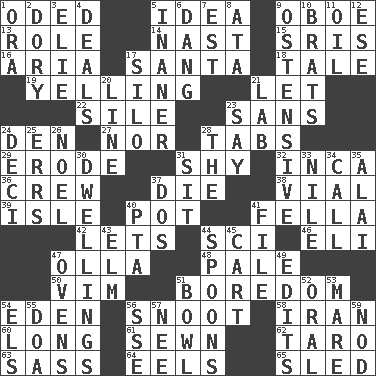 ACROSS 1. Wrote a lyric poem 5. The content of cognition 9. Mitch Miller's instrument 13. Hero or heavy, e.g. 14. Political cartoonist Thomas 15. Indian titles of respect 16. Roberta Peters solo 17. Before Barbara or Clara 18. Falsehood 19. Crying or shouting loudly 21. Allow 22. Drop; flow; fall 23. Without 24. Lair 27. Not either 28. Bar bills 29. Eat (away) 31. Like a shrinking violet 32. South American Indian 36. Ship's personnel 37. Pass on 38. Small bottle 39. Capri or Wight 40. Cooking vessel 41. Chap (slang) 42. Allows 44. _-fi 46. Connecticut Ivy Leaguer 47. Spanish pot 48. Diluted with white 50. Zeal 51. Mood resulting from idleness 54. Paradise 56. Snob 58. SW Asia republic 60. Having great length 61. Stitched 62. Edible starchy tuberous root 63. Backtalk 64. Snakelike fish 65. Downhill vehicle DOWN 1. Mouth or opening 2. Rowboat 3. Writer Wiesel 4. Allots cards 5. More empty; more void 6. Mild oath, euphamism for damn 7. Eastern Standard Time (abbr.) 8. _ moment's notice (2 wds.) 9. Clearly or manifestly demonstrative 10. Naughty children 11. Lubricate 12. Compass dir. 17. Grain storage tower 20. Actor's bit 21. Experiment locale 23. Declare 24. Tenth: prefix 25. Blunders 26. Christmas carol 28. Definite Article 30. Homes 31. Be seated 33. The longest river in the world 34. Give a ring to 35. Mountain range southwest of Kyrgyzstan 37. Two (Sp.) 40. Parent Teacher Association (abbr.) 41. Do some clerical work 43. Shade tree 44. Soup utensils 45. Haul 47. Baking chambers 49. Prepares for publication 51. Soup holder 52. Relating to the mouth 53. Female horse 54. Raised railways 55. ___ good deed 56. Compass dir. 57. Born 59. Dreamland