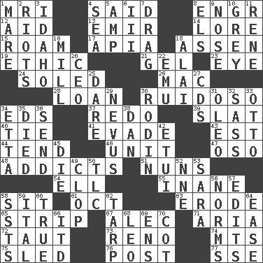 ACROSS 1. Medical imaging device (abbr.) 4. Alleged 8. Engineer (abbr.) 12. Help 13. Independent ruler or chieftain 14. Old wives' tales, e.g. 15. Wander aimlessly 17. Capital of Western Samoa 18. NE Netherlands city 19. Value system 21. Set 23. Sight organ 24. Having a sole or soles 26. Apple computer (short form) 28. Grant temporary use of 30. Noisy, rowdy, vocal (Spanish) 34. Begley and Asner 37. Redecorate 39. Narrow board 40. Neckwear 41. Elude 43. Eastern Standard Time (abbr.) 44. Look after 46. A single undivided whole 47. Bear (Spanish) 48. Inveterate users 51. Religious women 54. Pipe bend 55. Lacking in sense or substance 58. Be seated 61. Sep. follower 63. Eat (away) 65. Empty completely 67. Actor Baldwin 71. Operatic vocal solo 72. Tense 73. Western Nevada city 74. Mountains (abbr.) 75. Downhill vehicle 76. Mail 77. Compass dir. DOWN 1. Female horse 2. Disturbances 3. Potato state 4. Ocean 5. Electrical Unit 6. One more than two 7. To draw with force 8. Raised railways 9. Olfactory organ 10. Jennifer or Joel 11. French philosopher Descartes 16. Place where flour is made 18. Mountain range southwest of Kyrgyzstan 20. Corporate head (abbr.) 22. Australian flightless bird 25. Have the gumption 27. Music discs 29. Mole, birthmark 30. "The Thinker" sculptor 31. Margarine 32. Backtalk 33. Von Bismarck 34. Singer James 35. Passed on 36. Transmit 38. One of the 12 tribes of Israel 42. Needle case 45. Pass on 49. Hoof sound 50. Affectionate concern, for short 52. Compass dir. 53. "Two Mules for Sister ____" 56. Typical standards 57. Prepares for publication 58. Fast planes 59. Slanted text style (abbr.) 60. Loyal 62. Canvas cover 64. Relaxation 66. It would 68. Lion 69. Followers of ems 70. Small bed