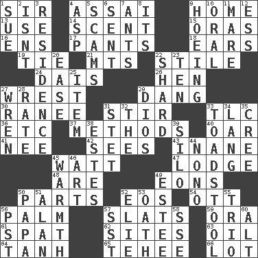 ACROSS 1. Title for a knight 4. Slender Brazilian palm 9. Dwelling 13. Purpose 14. Aroma 15. Mouths or openings 16. Followers of ems 17. Leg coverings 18. Hearing organs 19. Neckwear 21. Mountains (abbr.) 22. Vertical member of a panel or frame 24. Raised platform 26. Layer 27. Obtain by seizing forcibly or violently 29. Mild oath, euphamism for damn 30. The wife of a rajah (variant) 31. Agitate 33. Affectionate concern, for short 36. And so on (abbr.) 37. Modes 40. Rowing implement 41. Born 42. Observes 43. Silly 45. Electrical Unit 47. Inn 48. "We ___ not amused" (Victoria) 49. Immeasurably long periods of time 50. Components 52. Greek goddess of the dawn 54. Baseball player Mel 56. Inside of hand 57. Narrow boards 59. Mouth or opening 61. Argument over a trivial matter 62. Locates 63. Lubricate 64. Hyperbolic tangent 65. Giggle 66. Car dealer's back yard DOWN 1. Take to court 2. Is not 3. Dwelling 4. Cleo's killer 5. Fraudulent business schemes 6. Transmitted 7. Pismires 8. ___ a Wonderful Life 9. Cultivating 10. Of the mouth 11. Female horse 12. Curvy letter 20. Comfort 22. Pottery fragment 23. Nine, plus one 25. A whole individual unit 27. Songbird 28. Assign a rank or rating to 29. "Vaya con ____" 31. Proofreading order 32. Definite Article 33. Inedible or poisonous agaric 34. Austrian-born American filmmaker Fritz 35. Algonquian 38. _____ Park, CO 39. Grain storage tower 44. Words to Nanette 45. Heat 46. Tate display 49. First name in cosmetics 50. Dad 51. ____ Jay Lerner 52. Writer Wiesel 53. Pledge 55. Musical group of three 56. Pacific Standard Time (abbr.) 57. Fast jet (abbr.) 58. Compass dir. 60. Keyboard modifier key