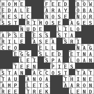 ACROSS 1. Dwelling 5. Nourish 9. Arrow shooter 12. Peak District village in England 14. Like ___ of sunshine 15. Chief or king in Benin or Nigeria 16. Of or pertaining to a meson 17. Sense of smell 18. Not either 19. Fast jet (abbr.) 20. Full of chinks, cracks, or crevices 23. Eons 24. Naked 25. _ and Stitch 27. Domed church section 30. Curvy letter 32. R.R. building 33. Cause heat under the collar 34. At sea 36. Indian title of respect (Mr.) 38. Corporate head (abbr.) 39. Pipe bend 40. Tired old horse 43. Oval reproductive body of a fowl 46. Downhill vehicle 48. Inactive volcano in Sicily 49. Flowery wreath 51. Health resort 52. Grant temporary use of 53. Adolescent 54. Sliced desserts 56. Comedian Laurel of Laurel & Hardy 58. Buttonhole 61. Make lace 64. The 19th letter of the Greek alphabet 65. Small Philippine buffalo 66. One or ones belonging to thee 68. Electrical Unit 69. Allows 70. Composer Copland 71. Portuguese money of account (variant) 72. Long journey 73. Grant temporary use of DOWN 1. Is hesitant and indecisive 2. Lyric poems 3. Vertical spar for supporting sails 4. Connecticut Ivy Leaguer 5. Papal veil 6. Greek god of love 7. Artist's stands 8. Color 9. Beat drum 10. Mitch Miller's instrument 11. Armed conflicts 13. Shade of tan 21. It may be bright or harebrained 22. Makes clutter 23. Having or resembling wings 24. Born 26. It is 27. Curve 28. Sliced dessert 29. _ gin 31. Exchanges for money 35. City in Syria 37. To the inside or interior of 41. Santa ___, CA 42. Separate the seeds from cotton 44. Small, secluded valley 45. Turn to the right 47. Raised platform 48. Raised railways 50. More lacking in sense or substance 53. Grayish beige 55. Singer James 56. Play the lead 57. Docile 59. ____ d'Azur (French Riviera) 60. Keg 61. Become fatigued 62. Soon (poet.) 63. Watch over 65. The first octave above the treble staff 67. Actor Linden
