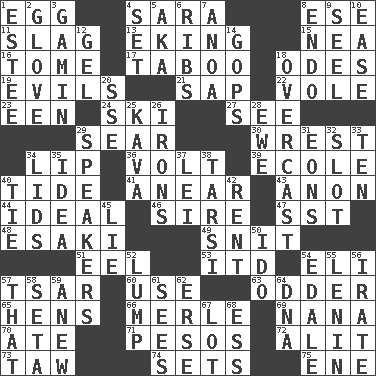 ACROSS 1. Ovum 4. "Two Mules for Sister ____" 8. Compass dir. 11. Volcanic refuse 13. Supplementing with great effort 15. Teachers' org. 16. Heavy book 17. Off limits 18. Lyric poems 19. Vices 21. Plant excrement 22. Short-tailed, large-bodied rat 23. Car or cant ending 24. What Jean-Claude Killy likes to do 27. Perceive with the eye 29. Burn superficially 30. Obtain by seizing forcibly or violently 34. Mouth edge 36. Electrical Unit 39. Learning spot: Fr. 40. Event that recurs at intervals 41. Approach 43. At once, immediately (arch.) 44. Perfect 46. Father 47. Fast jet (abbr.) 48. 1973 Nobel Price Winner (Physics) Leo 49. In a ____ (agitated or irritated) 51. Snakelike fish 53. It would 54. Connecticut Ivy Leaguer 57. Russian ruler of old 60. Purpose 63. More peculiar 65. Coop moms 66. Haggard of country music 69. Grandmother 70. Had dinner 71. Mexican monetary units 72. Set down 73. The 23rd letter of the Hebrew alphabet 74. Puts into a specified state 75. Compass dir. DOWN 1. First name in cosmetics 2. Michael Jackson trademark 3. Homeless child 4. Arrange properly for use 5. Alias (abbr.) 6. Teases 7. Small Philippine buffalo 8. Inside; within (prefix) 9. Sew up the eyelids of hawks and falcons 10. Relaxation 12. Set 14. Republicans 18. Cloudy 20. Compass dir. 25. Polynesian shrub of the pepper family 26. Metal shackles 28. She-sheep 29. Orators 31. Immeasurably long periods of time 32. Narrow opening 33. "___ Little Indians" 34. Hats (slang) 35. It may be bright or harebrained 37. Flowery wreath 38. Tarsus (plural) 40. Neckwear 42. Monthly bill 45. Falsehood 50. Wedding promise 52. Mass 54. Peak District village in England 55. Soviet premier 1918-24 56. Feeling or showing extreme anger 57. Not this but _ 58. Stalk of a moss capsule 59. Afresh 61. Perceives with the eye 62. Celtic language 64. Heredity factor (abbr.) 67. Car dealer's back yard 68. Curvy letter