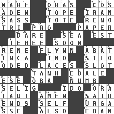 ACROSS 1. Female horse 5. Mouths or openings 9. Music discs 12. Arabian gulf 13. Drink excessively 14. SW Asia republic 15. Backtalk 16. Lug 17. Western Nevada city 18. Three (prefix) 19. Adept person 21. Some stationery 22. Have the gumption 24. Ocean 26. Eastern Standard Time (abbr.) 27. Giggle 28. Within a short period 29. French philosopher Descartes 30. Film actor Errol 32. Blind as ____ 36. South American Indian 37. Working for oneself (abbr.) 38. Grain storage tower 39. Wrote a lyric poem 40. Shoestrings 42. Groove 43. Hyperbolic tangent 44. Peak District village in England 46. Compass dir. 49. Chief or king in Benin or Nigeria 50. Unfeeling 51. Major League Baseball Commissioner Bud 53. Wedding promise 54. Mouth or opening 57. Tense 58. So be it 61. Stated 62. Conclusions 63. Automatically 64. Capital and largest city of Mongolia 65. Compass dir. 66. In addition 67. Dutch treat DOWN 1. Vertical spar for supporting sails 2. The sixth month of the Jewish calendar 3. Dwelling 4. Followers of ems 5. Von Bismarck 6. Friend of Pooh 7. Fitting 8. Observe 9. Streamer paper 10. Natives or inhabitants of Denmark 11. Derisive sound 14. Retirement account (abbr.) 19. Before (prefix) 20. Coral collection 21. Baking dish 23. Toward the future 24. Something which is sent 25. A really long time 27. Look after 28. Synchronize (abbr.) 29. River (Sp.) 31. Woody, climbing, usually tropical plant 32. Indian state 33. Big road sign 34. _ vera 35. Small child 40. Experiment locale 41. Transmit 43. Coat; cloak 45. Superhero pair 46. _____ Park, CO 47. Seines 48. Evade 52. ___ a Wonderful Life 53. Information 55. Capital of Latvia 56. First of billions? 58. White ___ sheet 59. Cartoonist voice _ Blanc 60. Raised railways 61. Take to court