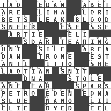 ACROSS 1. Bit 4. Dutch treat 8. Collude with 12. "We ___ not amused" (Victoria) 13. Pale green bean 14. Australian parrot (variant) 15. Wagers 17. Path through which fluid escapes 18. Vital fluid 19. Scornful expression 21. Compass dir. 23. Compass dir. 24. Nick name for Arthur 26. Biblical high priest 28. Neighbor of Neb. 30. Rending 34. Corn or form start 37. Filth; sediment 39. Length times width 40. One of the 12 tribes of Israel 41. Heavy duty weighing machine 43. Eastern Standard Time (abbr.) 44. Against 46. "Tell ____ the Marines!" 47. A female animal or person 48. Of or relating to Laos or its people 51. In a ____ (agitated or irritated) 54. Heredity factor (abbr.) 55. Took without asking 58. One (Scot) 61. Distant 63. Practice fights 65. Stone: prefix 67. Locale of original sin 71. Pulitzer Prize-winning author Ferber 72. Turn sharply 73. Billionth: prefix 74. Cards in a Roman deck? 75. Writer Wiesel 76. Colored 77. Snakelike fish DOWN 1. Bar bills 2. Sports stadium 3. Prevent from occurring 4. Pipe bend 5. Pass on 6. Nanny (var.) 7. Cause to be 8. Everything 9. Scornful sounds 10. Greek god of love 11. Periodic rise and fall of the sea level 16. Arranges properly for use 18. Actor Lugosi 20. To free from 22. Perceive with the eye 25. 90 degrees 27. Lyricist Gershwin 29. Japanese brewing company 30. Portable shelters 31. Angers 32. Tender 33. Yard entry 34. Allodial 35. Grandmother 36. To the inside or interior of 38. Car dealer's back yard 42. Immeasurably long periods of time 45. It would 49. Information 50. Auto club (abbr.) 52. It is 53. Drink excessively 56. Dipping utensil 57. Bert's buddy 58. Domed church section 59. 1994 drama film starring Jodie Foster 60. Needle case 62. Tear apart 64. Travel by water 66. Portuguese money of account (variant) 68. 24 hours 69. Compass dir. 70. Allow head to fall sleepily