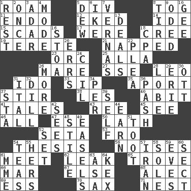 ACROSS 1. Wander 5. HTML Container Element 8. Coat; cloak 11. Inside; within (prefix) 12. Made supply last 14. Binary compound 15. Loads 17. Past tense of be (plural) 18. Algonquian 19. Cylindrical with tapered ends 21. Slept 23. The grampus (Milton) 25. Silent film actress Nazimova 26. Female horse 27. Compass dir. 28. Lion 31. Wedding promise 33. Small drink 35. To the left, to Queeg 37. Agitate 38. French article 40. "This won't hurt ____!" 41. Stories 43. Portuguese money of account (variant) 45. Observe 46. 100% 47. Compass dir. 50. Thin strip of wood or metal 52. Stalk of a moss capsule 53. Away 54. College paper 56. Annoying sounds 61. Rendezvous 62. Path through which fluid escapes 65. Collection of objects 66. Impair 67. Otherwise 68. Actor Baldwin 69. Curvy letter 70. Saxophone 71. A home for chicks DOWN 1. Take ten 2. Single time 3. The sixth month of the Jewish calendar 4. Method 5. Morning condensation 6. Mamie's mate 7. Actresses Bloom and Felton 8. Become fatigued 9. Wrote a lyric poem 10. Turn to the right 13. Allots cards 16. Portico 18. Tax preparer (abbr.) 20. Blunders 22. Entreaty 24. To provide with a ceiling 26. Greater amount 28. Ear part 29. One of the Great Lakes 30. Baseball player Mel 31. Slanted text style (abbr.) 32. Deli pickle 34. For each 36. Romantic infatuation 37. R.R. building 39. Oneself 42. Observes 44. Merit 48. Vertical member of a panel or frame 49. Artist's stands 51. A blast of a horn 52. Arrange properly for use 54. Afternoon social gatherings 55. Possessive pronoun 57. SW Asia republic 58. Not divided or shared with others 59. Nights before holidays 60. Religious group 61. Madame (abbr.) 63. White ___ sheet 64. Dry husk or covering