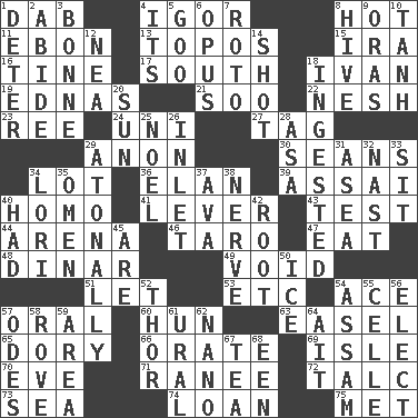 ACROSS 1. Apply (a substance) by light strokes 4. Composer Stravinsky 8. Being at a high temperature 11. Inky black, to poets 13. Literary convention 15. Lyricist Gershwin 16. Prong on a fork 17. 180 degrees 18. "Terrible" tsar 19. Ferber et al. 21. "Barney Miller" actor Jack 22. Tender 23. To riddle 24. Single; one (prefix) 27. Label 29. At once, immediately (arch.) 30. Seines 34. Car dealer's back yard 36. Flair 39. Slender Brazilian palm 40. Same (prefix) 41. Prying instrument 43. Trial 44. Sports stadium 46. Pacific island yam 47. Ingest 48. Middle Eastern gold or silver currency 49. Lacking any legal or binding force 51. Allow 53. And so on (abbr.) 54. Adept person 57. Of the mouth 60. Attila the _ 63. Artist's stand 65. Rowboat 66. Speak pompously 69. Capri or Wight 70. First lady 71. The wife of a rajah (variant) 72. Baby powder 73. Ocean 74. Grant temporary use of 75. Was introduced to DOWN 1. Prevent from occurring 2. Stay 3. Maid-servant 4. It is 5. Thick or sticky substance 6. Musical composition 7. Printing process, for short 8. Hub of activity 9. Mouths or openings 10. Hyperbolic tangent 12. Teachers' org. 14. Attempt 18. Eaten 20. Player for Phoenix 25. Christmas carol 26. An arm off of a larger body of water 28. White ___ sheet 29. Lacking a tonal center or key 31. At sea 32. Political cartoonist Thomas 33. Be seated 34. Australian parrot (variant) 35. Sign of things to come 37. Actress Gardner 38. Impudent aggressiveness 40. Possessed 42. Carrot, for example 45. "We ___ not amused" (Victoria) 50. Frozen water 52. Son of Odin 54. Indian state 55. Cell (Danish) 56. Opt 57. Lyric poems 58. Be footloose 59. Length times width 61. Mountain range 62. Billionth: prefix 64. Small island 67. Beverage made from leaves 68. Car or cant ending
