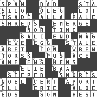 ACROSS 1. Connect, as a bridge 5. Male parent 8. R.R. building 11. Grain storage tower 12. Cassini of fashion 14. Car dealer's back yard 15. Sadhe (variant) 17. Silent film actress Nazimova 18. Light colored 19. Fragments 21. Develop 23. Not either 25. Prong on a fork 26. Indonesian resort city 27. Conclusion 28. Tired old horse 31. She-sheep 33. Ovum 35. Having lost freshness 37. Collude with 38. Electrically charged atom 40. Songbird 41. Cod relative 43. Fluid product of inflammation 45. Adept person 46. A saturated hydrocarbon 47. Followers of ems 50. Not women's 52. Writer Wiesel 53. Sound made by sheep 54. Oozed 56. Sounds asleep 61. Christmas carol 62. Sure thing 65. To the left, to Queeg 66. Pipe bend 67. One of the Great Lakes 68. Medicinal plant 69. Begley and Asner 70. Male offspring 71. Behest DOWN 1. Fast planes 2. Expression of disdain 3. Having or resembling wings 4. Connecting point 5. ___ good deed 6. 100% 7. Erase 8. Volcanic refuse 9. Lacquered or enameled metalware 10. Had dinner 13. Street urchin 16. Pulitzer Prize-winning author Ferber 18. Before (prefix) 20. Not divided or shared with others 22. Conclusions 24. Swiss mountan, "Queen of the Mountains" 26. Stakes 28. Drug cop 29. Toward shelter 30. Commissioned mil. rank 31. Inky black, to poets 32. Past tense of be (plural) 34. Republican Party 36. It was, poetically 37. _ moment's notice (2 wds.) 39. Unfeeling 42. Seaweed 44. Oceans 48. Sibling's daughter 49. Spring feasts 51. Grandmother 52. Snakelike fish 54. Disposed of to a purchaser 55. Snakelike fish 57. Brightly colored fish 58. Hero or heavy, e.g. 59. Greek god of love 60. Proofreading order 61. Born 63. River (Sp.) 64. Nine, plus one