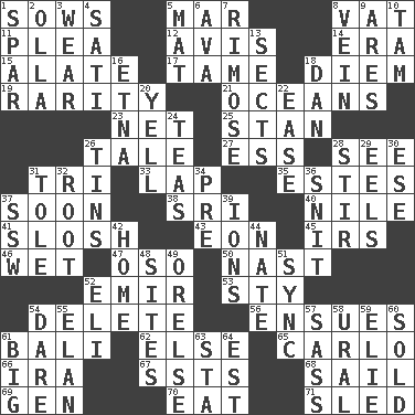 ACROSS 1. Sty mamas 5. Spoil 8. Large container 11. Entreaty 12. Deliberation 14. Period 15. Having winglike extensions 17. Docile 18. South Vietnam president (1954) 19. Noteworthy scarcity 21. Seas 23. Remaining after all deductions 25. Comedian Laurel of Laurel & Hardy 26. Falsehood 27. Double-curved letter 28. Perceive with the eye 31. Three (prefix) 33. Pet locale 35. _____ Park, CO 37. Within a short period 38. Indian title of respect (Mr.) 40. The longest river in the world 41. Agitate, as a liquid 43. Period of immesurable duration 45. Big collection agency 46. Soggy 47. Bear (Spanish) 50. Political cartoonist Thomas 52. Arab leader 53. Filthy place 54. Keyboard key 56. Takes place subsequently 61. Indonesian resort city 62. Otherwise 65. Monte _, Las Vegas Hotel/Casino 66. Lyricist Gershwin 67. Fast planes 68. Move on water 69. Commissioned military rank (abbr.) 70. Erode 71. Downhill vehicle DOWN 1. Coast Guard woman 2. Rounded earthenware pot or jar 3. Put on (as clothing) 4. Suttee (variant) 5. Floor protector 6. Actress Gardner 7. Full of chinks, cracks, or crevices 8. Distinctive style or manner 9. Ancient Greek god of war 10. Scottish cap 13. Religious groups 16. Inactive volcano in Sicily 18. Daniel's nick name 20. Shout 22. Relaxation 24. Afternoon social gatherings 26. Metal containers 28. Move through with a circular motion 29. Snakelike fish 30. Compass dir. 31. Lacquered or enameled metalware 32. Carrot, for example 34. Before (prefix) 36. In a ____ (agitated or irritated) 37. Compass dir. 39. Charged atoms 42. Residence 44. Nathan's nickname 48. Locates 49. Threatening words 51. Synchronize (abbr.) 52. Connecticut Ivy Leaguer 54. Have the gumption 55. Enthusiasm 57. Backtalk 58. Mountain range 59. Writer Wiesel 60. Disposed of to a purchaser 61. Large 63. R.R. building 64. Eastern Standard Time (abbr.)