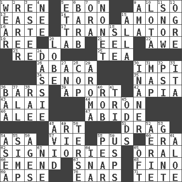 ACROSS 1. Songbird 5. Inky black, to poets 9. In addition 13. Comfort 14. Pacific island yam 15. Amid 16. Johnson of "Laugh-In" 17. Interpreter 19. To riddle 20. Experiment locale 21. Snakelike fish 22. Deep reverence 23. Do over again 25. Beverage made from leaves 26. Phillipine bananalike plant 30. Body of Kaffir warriors 34. Sir (Sp.) 35. Political cartoonist Thomas 36. Long, evenly shaped pieces 39. To the left, to Queeg 42. Capital of Western Samoa 43. Jai _ 44. Person of subnormal intelligence 46. Toward shelter 47. Stay 48. Nonscientific branch of learning 51. To trail on the ground 54. White ___ sheet 57. Compete 58. Product of festering 60. Period 62. Seigniories (variant) 65. Relating to the mouth 66. Make improvements or corrections to 67. Fastener 68. Fine (Spanish) 69. Domed church section 70. Hearing organs 71. Wig DOWN 1. Put on (as clothing) 2. Less widely known 3. First name in cosmetics 4. Born 5. Singer James 6. Sharp remark 7. Mouth or opening 8. Music written for nine 9. Nanny (var.) 10. Globular water bottle used in Asia 11. Overwhelm 12. Legendary monster 15. Silent film actress Nazimova 18. Observe 20. Ear part 24. Small ungulate mammals of Africa 27. Santa ___, CA 28. Police officer (slang) 29. Scent 30. Sillier 31. Atlas unit 32. Air pressure measure (abbr.) 33. Call ___ day 36. Sound made by sheep 37. Everything 38. Actress Charlotte 40. Director Reiner 41. Three (prefix) 45. Probability 48. Enthusiastic 49. River (Sp.) 50. Laconic 52. Nest on high 53. Let have 54. At sea 55. Simple or foolish person 56. Ripens 58. Lightbulb-shaped fruit 59. United States Postal Service (abbr.) 61. _ vera 63. Compass dir. 64. _ tizzy (2 wds.) 65. Often (poetically)