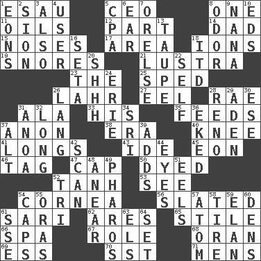 ACROSS 1. He sold his birthright 5. Corporate head (abbr.) 8. Single 11. Lubricates 12. Component 14. June honoree 15. Olfactory organs 17. Length times width 18. Charged particles 19. Sounds asleep 21. A period of five years 23. Definite Article 25. Broke a traffic law 26. Cowardly lion portrayer 27. Snakelike fish 28. Actress Charlotte 31. Chicken ___ king 33. Part of HMS, perhaps 35. Gives food to 37. At once, immediately (arch.) 38. Period 40. Leg joint 41. Yearns 43. Binary compound 45. Period of immesurable duration 46. Label 47. Head covering 50. Colored 52. Hyperbolic tangent 53. Perceive with the eye 54. Pupil covering 56. Scheduled 61. Indian skirt 62. Ancient Greek god of war 65. Vertical member of a panel or frame 66. Health resort 67. Hero or heavy, e.g. 68. Northwest Algerian city 69. Curvy letter 70. Fast jet (abbr.) 71. Not women's DOWN 1. Immeasurably long periods of time 2. The Jewish people; Israel 3. In addition 4. One who makes use of a thing 5. Numbers guy (abbr.) 6. Hearing organ 7. Threatening words 8. Scent 9. Grandmother 10. Begley and Asner 13. Grayish beige 16. Bristle 18. It would 20. Quiet! 22. Itself 24. One of the Great Lakes 26. Long (Scottish) 28. Former U.S. Attorney General Janet 29. An important port of Yemen 30. Compass dir. 31. Small Philippine buffalo 32. Protracted 34. _ Lanka 36. Supplemented with great effort 37. The first octave above the treble staff 39. Does sums 42. Examine minutely or intensely 44. Sight organs 48. Approach 49. N Egypt peninsula 51. Snakelike fish 52. Three (prefix) 54. Balmoral and tarboosh 55. Mouths or openings 57. Tiny particle 58. Become fatigued 59. Flair 60. Hiding places for outlaws 61. Compass dir. 63. Raised railways 64. Put into a specified state