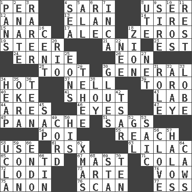 ACROSS 1. For each 4. Indian skirt 8. One who uses or employs something 12. Santa ___, CA 13. Enthusiasm 14. Hoop that covers a wheel 15. Drug cop 17. Actor Baldwin 18. Nothings 19. Guide 21. Black tropical American cuckoo 23. Eastern Standard Time (abbr.) 24. Bert's buddy 26. A really long time 28. A blast of a horn 30. Commissioned military rank 34. Being at a high temperature 37. 1994 drama film starring Jodie Foster 39. "Corrida" creature 40. Supplement with great effort 41. Yell 43. Experiment locale 44. Ancient Greek god of war 46. Sight organs 47. Sight organ 48. Flamboyance 51. Settles 54. Luau course 55. Arrive at 58. Purpose 61. Acura sports coupe 63. Pale purple color 65. Continued (abbr.) 67. Vertical spar for supporting sails 71. Root beer relative 72. Farming town in central California 73. Johnson of "Laugh-In" 74. Promise 75. At once, immediately (arch.) 76. Skim 77. Double-curved letter DOWN 1. Zero-star reviews 2. Maternal 3. More valued for its uncommonness 4. Ocean 5. 100% 6. Actress Charlotte 7. South American Indian 8. Shoshoni 9. Male parent of an animal 10. Greek god of love 11. State of inaction 16. Penny 18. The Jewish people; Israel 20. River (Sp.) 22. Born 25. Immeasurably long periods of time 27. Remaining after all deductions 29. Giggle 30. Cements 31. Hero or heavy, e.g. 32. Like ___ of sunshine 33. Ear part 34. Pile 35. Gumbo ingredient 36. Adolescent 38. Myrna of the movies 42. Russian ruler of old 45. Plant excrement 49. Drawstring 50. Part of HMS, perhaps 52. Set 53. Ketch in the Levant 56. Garlic unit 57. Rings 58. Southern CA. univ. 59. Within a short period 60. Inside; within (prefix) 62. Dec. holiday 64. Crow sounds 66. Metal container 68. Curve 69. R.R. building 70. Nine, plus one