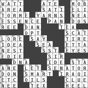 ACROSS 1. Electrical Unit 5. Had dinner 8. Disorderly crowd 11. Length times width 12. Suttee (variant) 14. Connecticut Ivy Leaguer 15. Singer Mel 17. Entertaining tales 18. Teachers' org. 19. Center 21. Baking dish 22. Two (Sp.) 23. To sift 24. Daniel's nick name 25. Beverage made from leaves 27. Elect 28. Get outta here! 31. Old wives' tales, e.g. 35. Declare 37. Hoop that covers a wheel 38. It may be bright or harebrained 39. Ocean 41. Singer James 42. Egg locale 43. Fast jet (abbr.) 45. Sight organs 46. Singer Brickell 47. Title for a knight 49. Heredity factor (abbr.) 51. Binary compound 52. R.R. building 55. One (Scot) 57. Allow 60. Legislator 62. Spanish title 63. Don Adams' spy role 65. Resident of Iraq 66. And so on (abbr.) 67. Petroleums 68. A slight indication 69. Born 70. John Ritter's dad 71. Person who is morally reprehensible DOWN 1. Wetness 2. Came up 3. Laconic 4. Not wild 5. White ___ sheet 6. Canvas cover 7. Inactive volcano in Sicily 8. Ananias' fault 9. Margarine 10. Prejudice 13. Is not 16. Inside; within (prefix) 17. Gossips 20. Balmoral and tarboosh 26. First name in cosmetics 29. Johnson of "Laugh-In" 30. Beverages made from leaves 31. Actor's bit 32. Wrote a lyric poem 33. Home 34. Eroded 36. Consenting reply 40. Aid 44. Event that recurs at intervals 48. Painter Guido (1575-1642) 50. In addition 52. Having lost freshness 53. Woman's close-fitting hat 54. Satellite of Uranus 55. Arabian gulf 56. Make mention of 58. Send forth 59. Lie 61. Bowlike part 64. Acura sports coupe