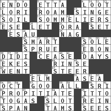 ACROSS 1. Inside; within (prefix) 5. Singer James 9. Spoils 13. Australian parrot (variant) 14. Wander aimlessly 15. Burn superficially 16. Land 17. Wine waiters 19. Compass dir. 20. Allow 21. Mouth or opening 22. Arrange properly for use 23. Son of Isaac 25. Tired old horse 26. Don Adams' spy role 30. Not divided or shared with others 34. Disorder 35. Inky black, to poets 36. "You Light Up My Life" star Conn 39. Desist 42. 24-hour periods 43. Makes supply last 44. Remove soap 46. Gone 47. Bull 48. Shade tree 51. At sea 54. Sep. follower 57. Thick or sticky substance 58. 100% 60. Indian title of respect (Mr.) 62. Conciliate 65. "Tell ____ the Marines!" 66. Ancient Roman robes 67. Slit 68. It's straight from the horse's mouth 69. Connect, as a bridge 70. Scottish caps 71. Observes DOWN 1. Otherwise 2. Trap for birds or small mammals 3. Frees from moisture 4. Lubricate 5. Celtic language 6. A blast of a horn 7. Scottish cap 8. ID or VA city 9. Cards in a Roman deck? 10. Washington bills 11. Legendary monster 12. Trial 15. Volcanic refuse 18. Period 20. Mass 24. Aid 27. Curve 28. Regret 29. Pulls into pieces 30. Spring feasts 31. Chief or king in Benin or Nigeria 32. Myrna of the movies 33. Followers of ems 36. Morning condensation 37. D.D.E's nickname 38. Lair 40. Be seated 41. Compass dir. 45. Lick closed 48. The front part of a cuirass 49. Car dealer's back yard 50. Damp 52. First name in cosmetics 53. Nick name for Arthur 54. Chooses 55. Riding implement 56. Ancient Roman robe 58. Smallest unit of an element 59. Allows 61. Charged atoms 63. Baking dish 64. In the manner of 65. Big collection agency
